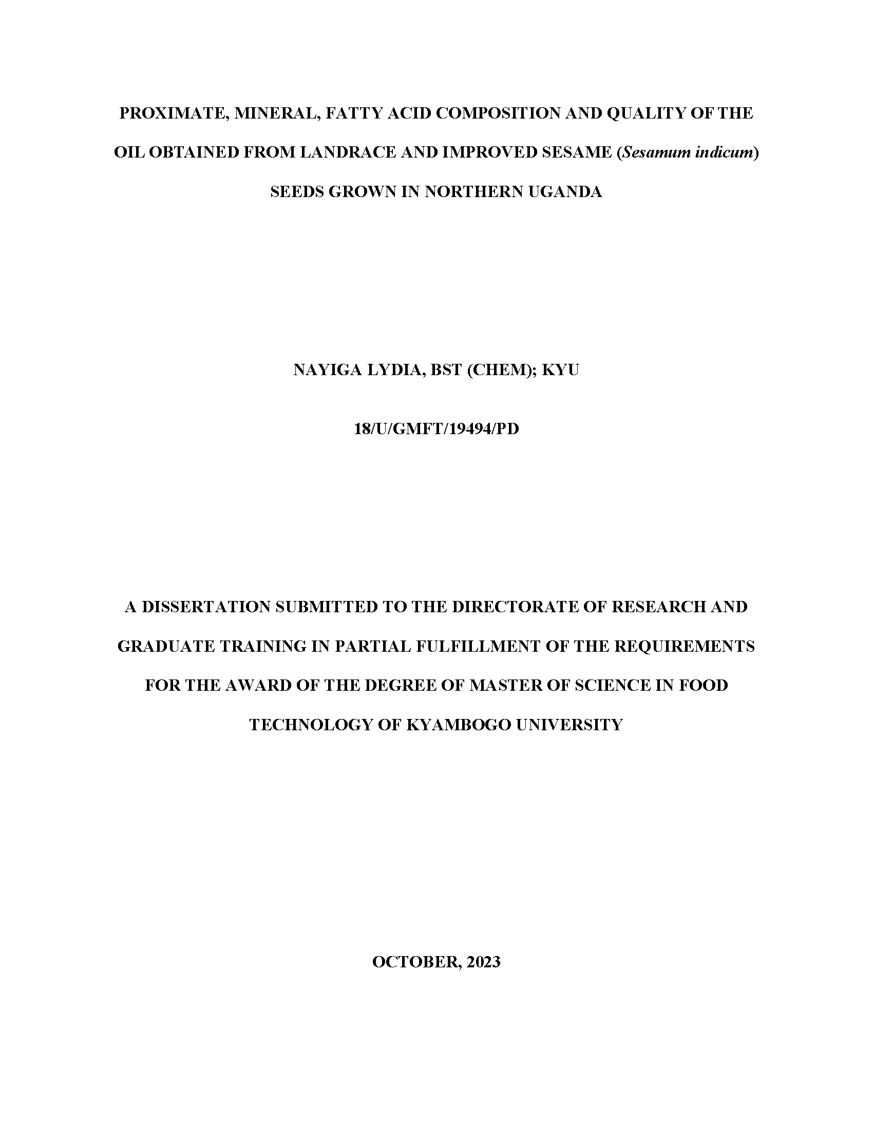 Item Dough rheology and baking properties of bread from wheat/ hybrid banana composite flour(Kyambogo University (Unpublished work), 2024-02) Kimera, BakerIn spite of high productivity and good agronomic adoptability of hybrid cooking bananas, they have undesirable sensory characteristics hence low consumer acceptability. This study aimed at evaluating the effect of partial substitution of wheat with hybrid cooking banana flour on the dough rheology and baking properties of composite bread. Five hybrid banana varieties; M30, M9, N15, N21 and N23 were used in this study. Bananas at green maturity were processed into flour and blended with wheat to make various composite flours (10/90, 20/80, 30/70 and 40/60%). Unblended wheat flour (100%) was used as a control. The different blends were then used to make the wheat composite bread using the straight-dough method. Rheological properties of the composite dough were analyzed using a consistograph (water absorption capacity and maximum pressure), alveograph (peak height, extensibility and baking strength) and farinograph (mixing tolerance index and development time). Textural properties (hardness, springiness, cohesiveness) were determined using the texture analyzer while sensory attributes were investigated using the 9-point hedonic scale. The dough rheology values reported in this study ranged from; water absorption capacity (47.25% to 54.45%), maximum pressure (1315.50 mbar to 2911.50 mbar), peak height (82.50 mm to 151.50 mm), extensibility (19.50 mm to 113.50 mm), baking strength (67.50 J to 244.50 J), development time (1.10 min to 5.40 min) and mixing tolerance index (86.00 BU to 175.50 BU). Hardness increased with increasing banana flour percentage inclusions, ranging from 2.09 N to 4.39 N. Springiness had no specific trend across the hybrids, but ranged from 0.35 to 0.80. Cohesiveness decreased with an increase in banana flour inclusion levels, ranging from 0.05 to 0.56. Sensory evaluation results showed a decrease in panel acceptability of the composite bread as the percentage inclusion of hybrid banana flour increased. The best scores for the sensory parameters evaluated were recorded at 10% inclusions of M30. Inclusion of hybrid banana flour up to 10% for all varieties studied as well as 20% inclusions for M30, N21 and N15 was comparable to 100% wheat flour. It is therefore recommended to use up to 20% inclusion levels of hybrid cooking banana flour from M30, N21 and N15 in preparation of hybrid banana / wheat composite bread.Item Contribution of selected ingredients to the quality of wheat/unpeeled orange fleshed sweet potato puree composite bread(Kyambogo University (Unpublished work), 2024-02) Skaka, VitalisThe development of bread from composite formulations is increasing and has attracted much attention from researchers driven by the desire to find non-wheat-bread-making alternatives in order to reduce dependence on imported wheat. However, formulation and production of acceptable composite bread requires understanding the effects of ingredients on bread quality. this study aimed at assessing the contribution of selected ingredients to the quality of composite dough made from wheat flour and unpeeled orange-fleshed sweet potato (OFSP) puree as well as physical qualities, nutritional composition, and consumer acceptability of the resultant bread. A 2-level fractional factorial design (28-3) at resolution IV was used to design a screening experiment and Response Surface Methodology (RSM) was used to analyze data. Prmax and water Absorption of the composite dough were studied using the alveoconsistograph. Physical properties and nutritional composition of composite bread were analyzed using AACC, AOAC and ICC standard methods. Consumer acceptability was assessed by an untrained panel of evaluators using a 9-point Hedonic scale. Significant models were developed at p<0.05 and coefficient of determination, R2 was used to test fitness of the model terms. Prmax and Water absorption decreased as proportions of unpeeled OFSP puree increased from 20% to 50%. Proportion of unpeeled OFSP puree negatively affected crumb colour, specific volume, springiness, flavour, aroma and general acceptability but had a positive effect on weight, moisture content, Total carotenoid content, β-carotene content, vitamin A content, reducing sugar content, protein content, Amylose and amylopectin ratio and starch content. Yeast positively affected volume and crust colour with negative effect on baking loss, staling rate, firmness and chewiness. Treatment of unpeeled OFSP (pasteurized and unpasteurized/fresh) negatively affected texture. Variety had a significant effect on crude fiber with NASPOT13O having a negative effect and NKB135 exhibiting a positive effect. Fat negatively affected cohesiveness. Ascorbic acid (improver) had the least effect on the study responses. Principal component Analysis indicated a negative correlation between nutritional and sensory properties. a positive correlation between textural properties and sensory properties and a high correlation between physical and sensory properties of the bread were observed. The study concluded that the most significant among the selected ingredients that affected quality of wheat/unpeeled OFSP puree bread were proportion of puree, yeast and fat. The study also concluded that treatment and variety had significant effects on the quality of the composite bread.Item Effect of 1-methylcyclopropene treatment on the physico-chemical attributes and postharvest green life of Ugandan indigenous and hybrid cooking bananas(Kyambogo University (Unpublished work), 2024-02) Kisakye, SarahIn this study, the efficacy of 1-methylcyclopropene (1-MCP), an ethylene inhibitor was evaluated in extending the green life of harvested mature green East African Highland (EAH) bananas including hybrid cooking bananas (Matooke). The main objective was to lengthen the green life of the EAH cooking bananas while maintaining phy