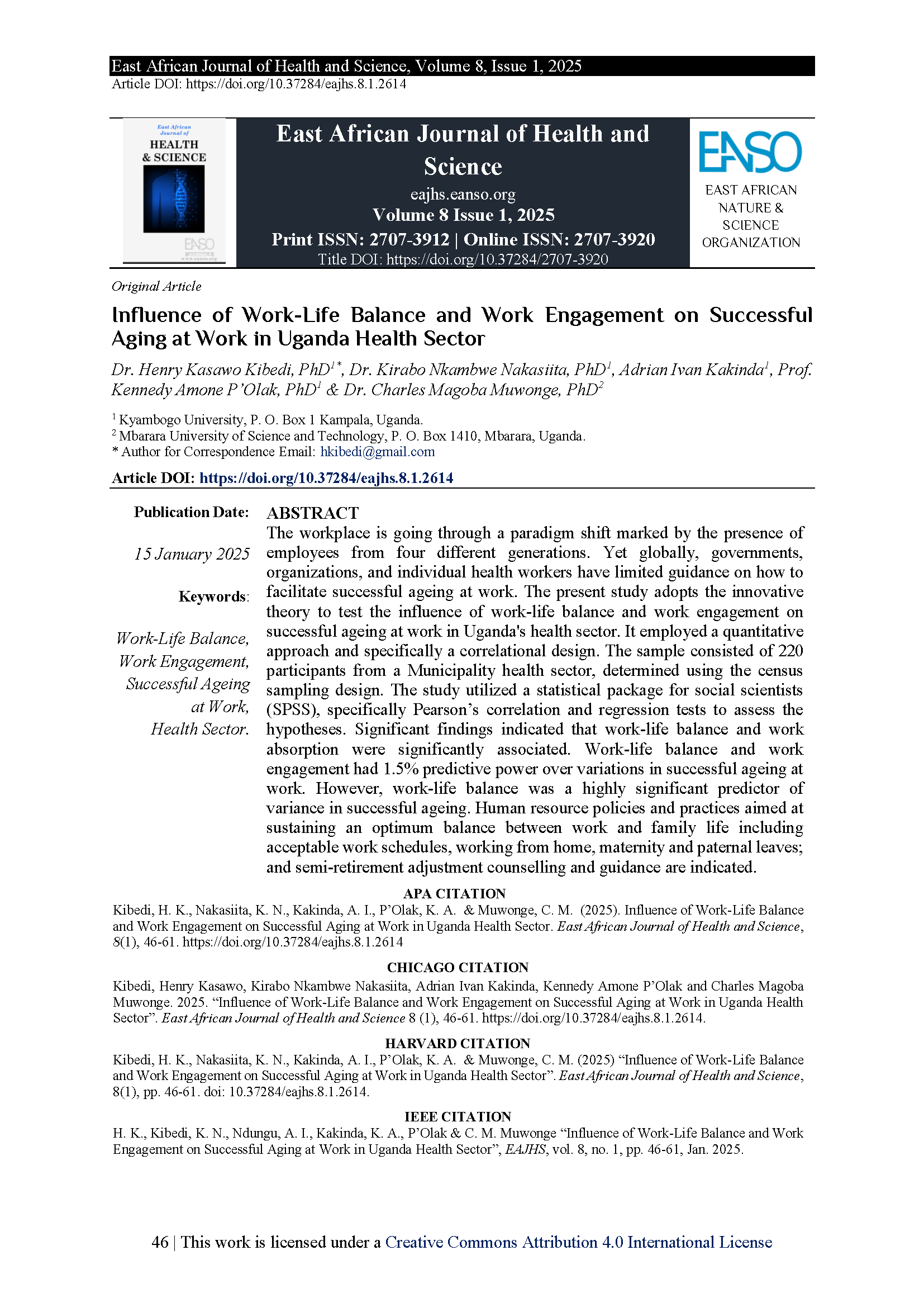 Kibedi, H. K., Nakasiita, K. N., Kakinda, A. I., P’Olak, K. A., & Muwonge, C. M. (2025). Influence of Work-Life Balance and Work Engagement on Successful Aging at Work in Uganda Health Sector. East African Journal of Health and Science, 8(1), 46-61.