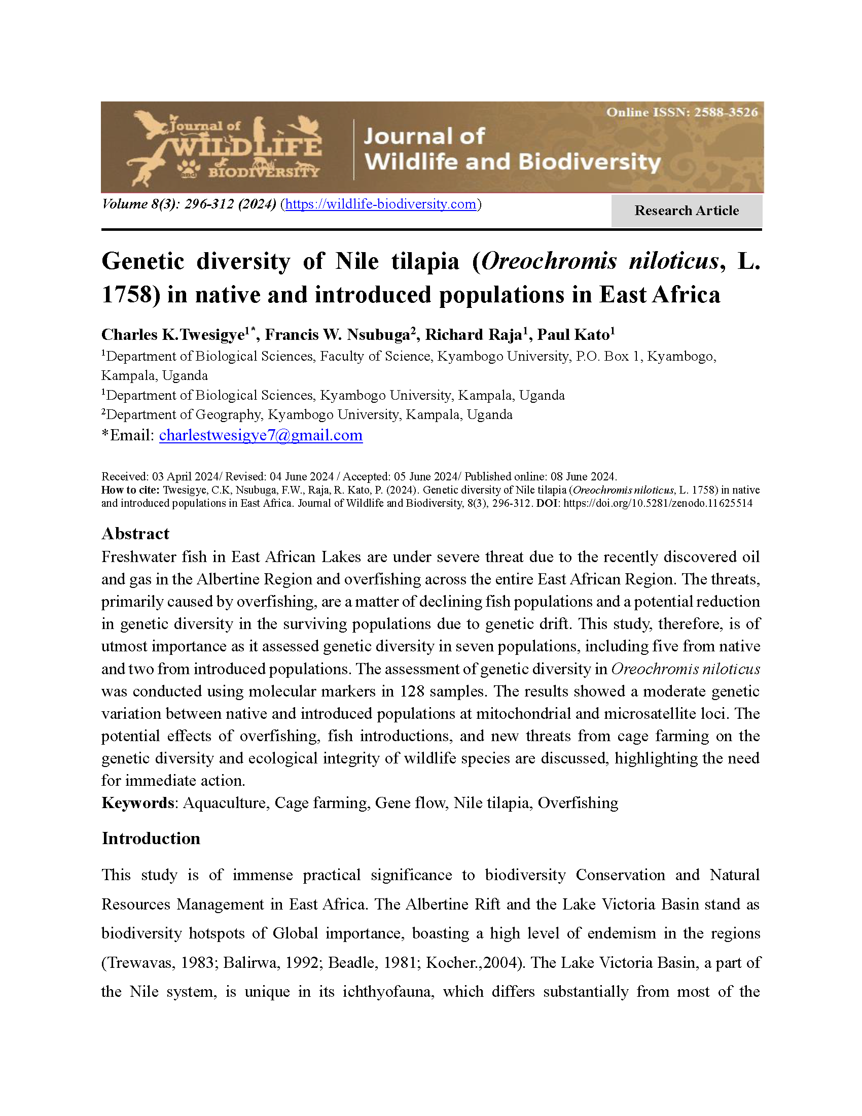 Kakuhikire, C. T. (2024). Genetic diversity of Nile tilapia (Oreochromis niloticus, L. 1758) in native and introduced populations in East Africa. Journal of Wildlife and Biodiversity, 8(3), 296-312.