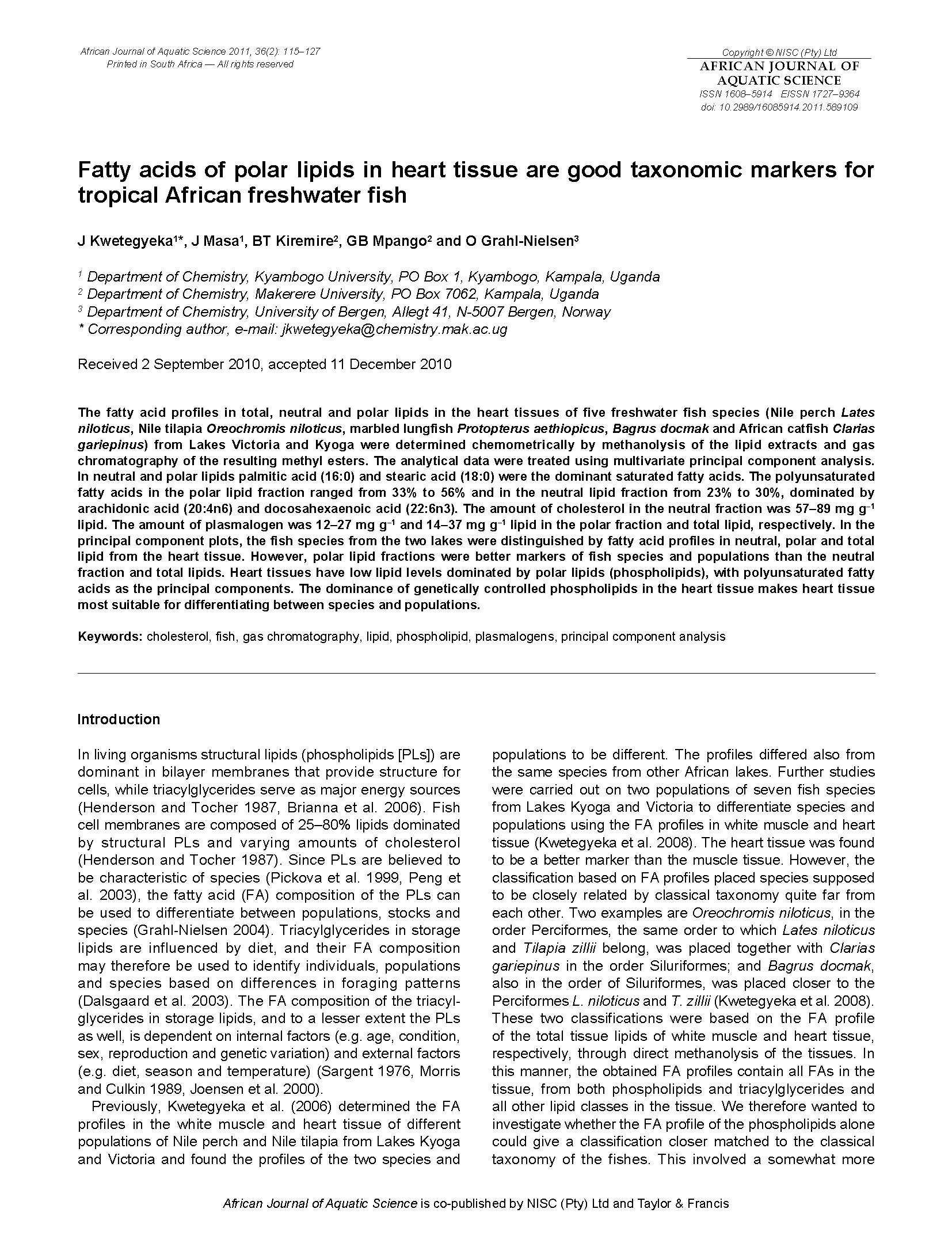 Kwetegyeka, J., Masa, J., Kiremire, B. T., Mpango, G. B., & Grahl-Nielsen, O. (2011). Fatty acids of polar lipids in heart tissue are good taxonomic markers for tropical African freshwater fish. African Journal of Aquatic Science, 36(2), 115-127.