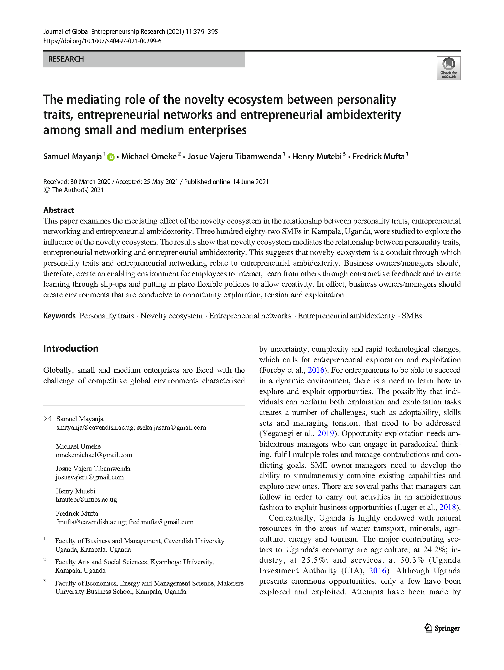 Mayanja, S., Omeke, M., Tibamwenda, J. V., Mutebi, H., & Mufta, F. (2021). The mediating role of the novelty ecosystem between personality traits, entrepreneurial networks and entrepreneurial ambidexterity among small and medium enterprises. Journal of Global Entrepreneurship Research, 1-17.