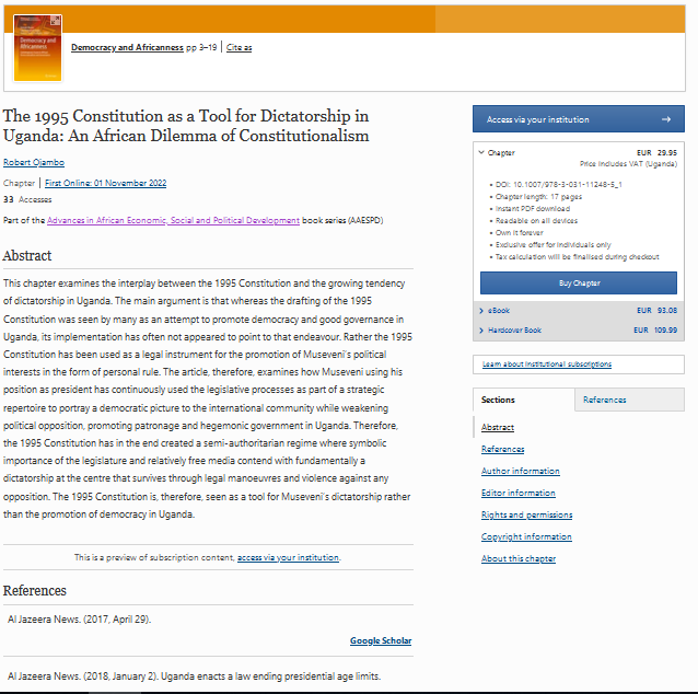 Ojambo, R. (2022). The 1995 Constitution as a Tool for Dictatorship in Uganda: An African Dilemma of Constitutionalism. In: Muzee, H., Sunjo, T.E., Enaifoghe, A.O. (eds) Democracy and Africanness. Advances in African Economic, Social and Political Development. Springer, Cham. https://doi.org/10.1007/978-3-031-11248-5_1