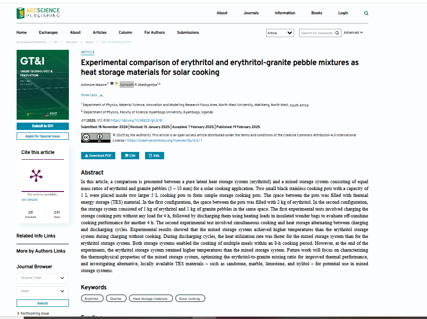 Mawire, A., & Abedigamba, O. P. (2025). Experimental comparison of erythritol and erythritol-granite pebble mixtures as heat storage materials for solar cooking. Green Technology & Innovation, 1(1), 6191.