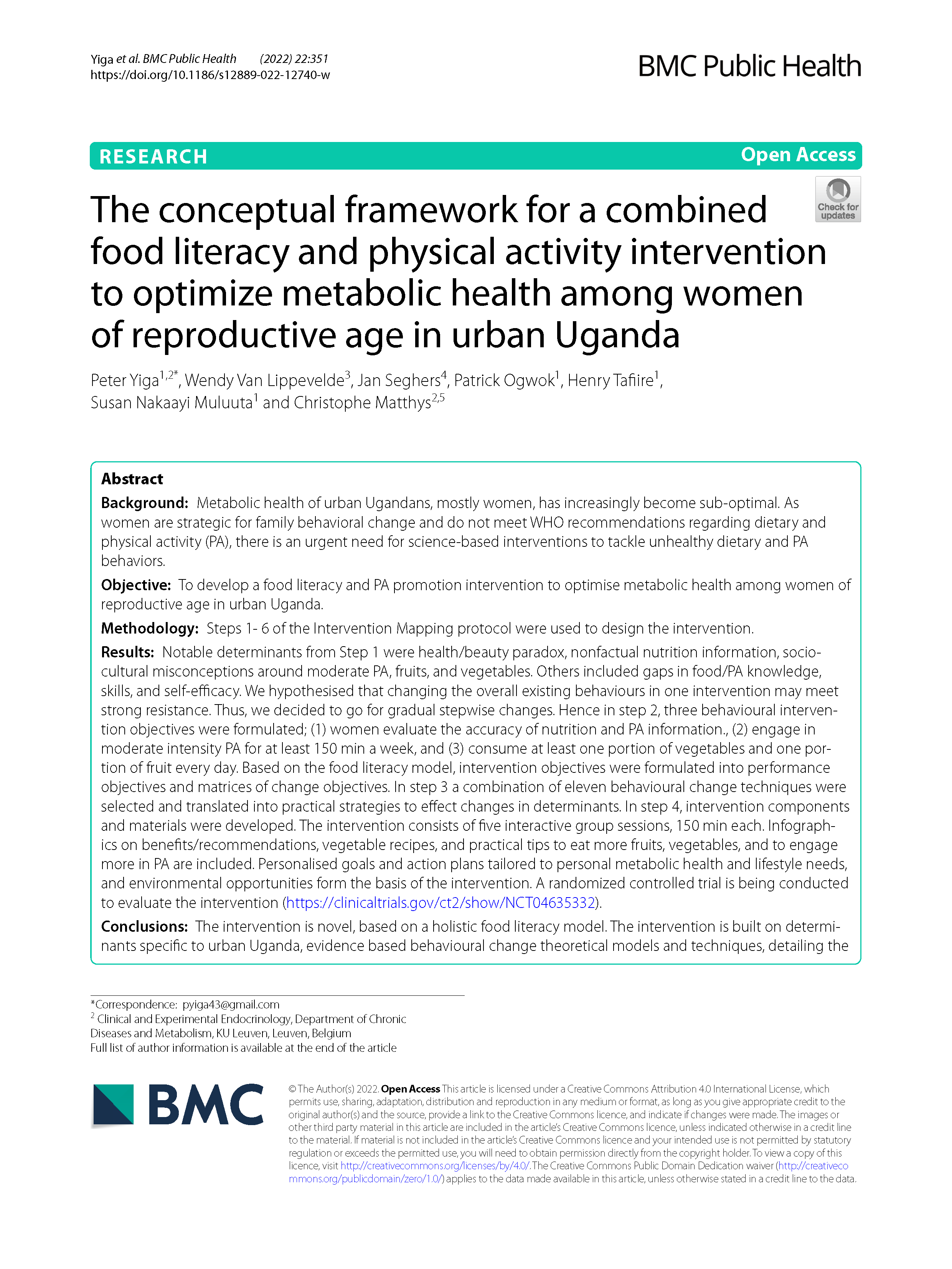 | dc.description.abstract | Background Metabolic health of urban Ugandans, mostly women, has increasingly become sub-optimal. As women are strategic for family behavioral change and do not meet WHO recommendations regarding dietary and physical activity (PA), there is an urgent need for science-based interventions to tackle unhealthy dietary and PA behaviors. Objective To develop a food literacy and PA promotion intervention to optimise metabolic health among women of reproductive age in urban Uganda. Methodology Steps 1- 6 of the Intervention Mapping protocol were used to design the intervention. Results Notable determinants from Step 1 were health/beauty paradox, nonfactual nutrition information, socio-cultural misconceptions around moderate PA, fruits, and vegetables. Others included gaps in food/PA knowledge, skills, and self-efficacy. We hypothesised that changing the overall existing behaviours in one intervention may meet strong resistance. Thus, we decided to go for gradual stepwise changes. Hence in step 2, three behavioural intervention objectives were formulated; (1) women evaluate the accuracy of nutrition and PA information., (2) engage in moderate intensity PA for at least 150 min a week, and (3) consume at least one portion of vegetables and one portion of fruit every day. Based on the food literacy model, intervention objectives were formulated into performance objectives and matrices of change objectives. In step 3 a combination of eleven behavioural change techniques were selected and translated into practical strategies to effect changes in determinants. In step 4, intervention components and materials were developed. The intervention consists of five interactive group sessions, 150 min each. Infographics on benefits/recommendations, vegetable recipes, and practical tips to eat more fruits, vegetables, and to engage more in PA are included. Personalised goals and action plans tailored to personal metabolic health and lifestyle needs, and environmental opportunities form the basis of the intervention. A randomized controlled trial is being conducted to evaluate the intervention (https://clinicaltrials.gov/ct2/show/NCT04635332). Conclusions The intervention is novel, based on a holistic food literacy model. The intervention is built on determinants specific to urban Uganda, evidence based behavioural change theoretical models and techniques, detailing the hypothesised behavioural change mechanism. If effective, an evidence-based intervention will become available for reference in urban Uganda. | en_US |