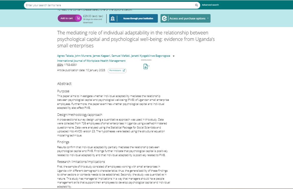 Tabala, A., Munene, J., Kagaari, J., Mafabi, S., & Bagorogoza, J. K. (2025). The mediating role of individual adaptability in the relationship between psychological capital and psychological well-being: evidence from Uganda’s small enterprises. International Journal of Workplace Health Management.