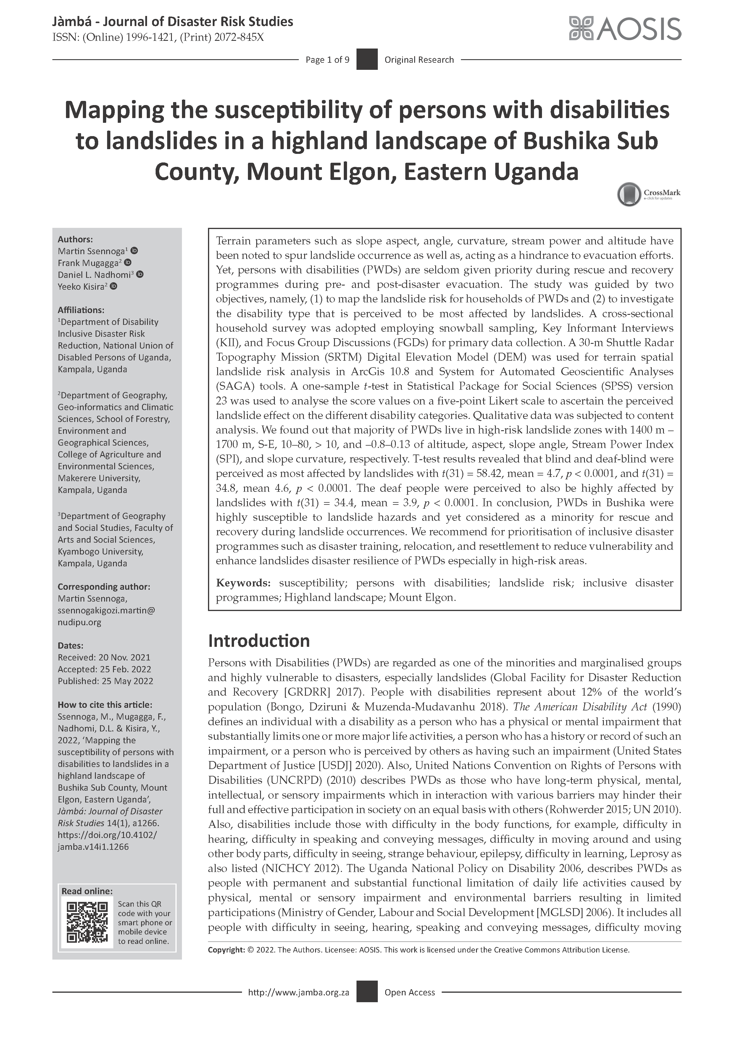 Ssennoga, M., Mugagga, F., Nadhomi, D.L. & Kisira, Y., 2022, ‘Mapping the susceptibility of persons with disabilities to landslides in a highland landscape of Bushika Sub County, Mount Elgon, Eastern Uganda’, Jàmbá: Journal of Disaster Risk Studies 14(1), a1266. https://doi.org/10.4102/ jamba.v14i1.1266