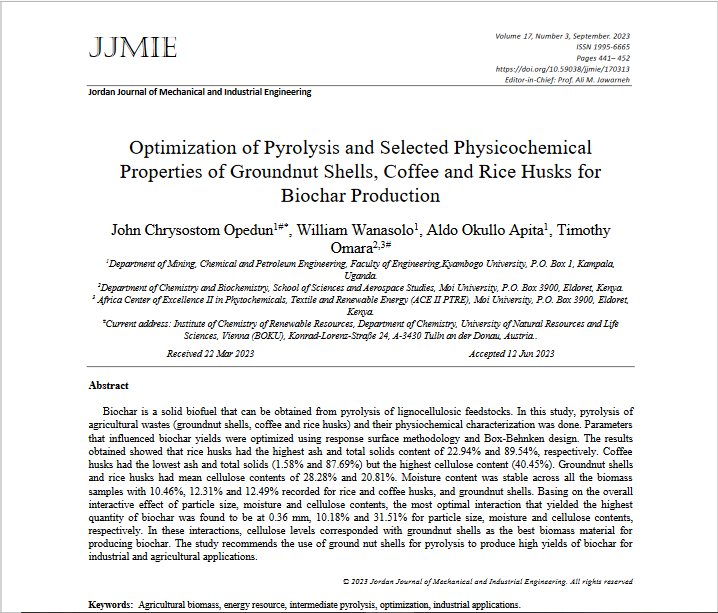 Opedun, J. C., Wanasolo, W., Apita, A. O., & Omara, T. (2023). Optimization of Pyrolysis and Selected Physicochemical Properties of Groundnut Shells, Coffee and Rice Husks for Biochar Production. JJMIE, 17(3).