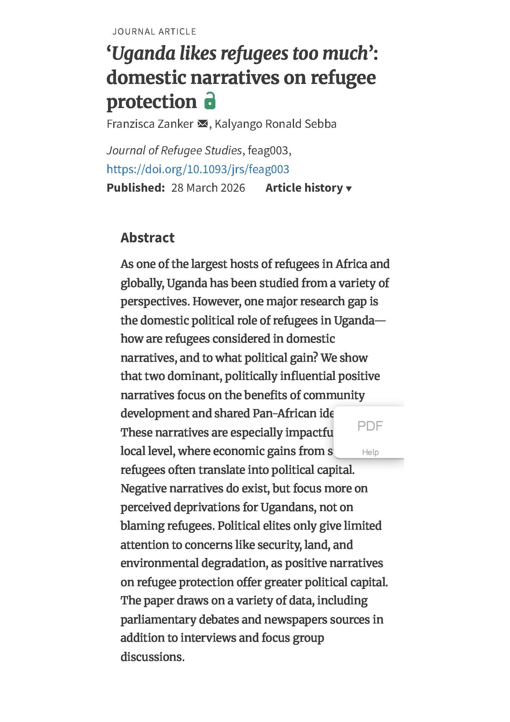 Zanker, F., & Sebba, K. R. (2026). ‘Uganda likes refugees too much’: domestic narratives on refugee protection. Journal of Refugee Studies, feag003. https://doi.org/10.1093/jrs/feag003