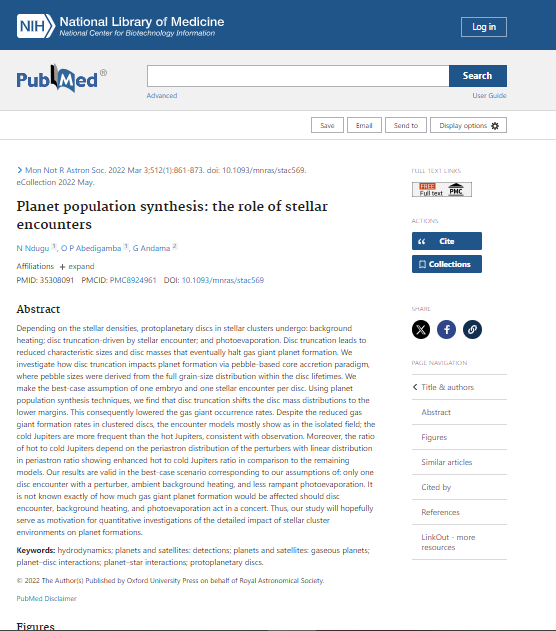Ndugu, N., Abedigamba, O. P., & Andama, G. (2022). Planet population synthesis: the role of stellar encounters. Monthly Notices of the Royal Astronomical Society, 512(1), 861-873.