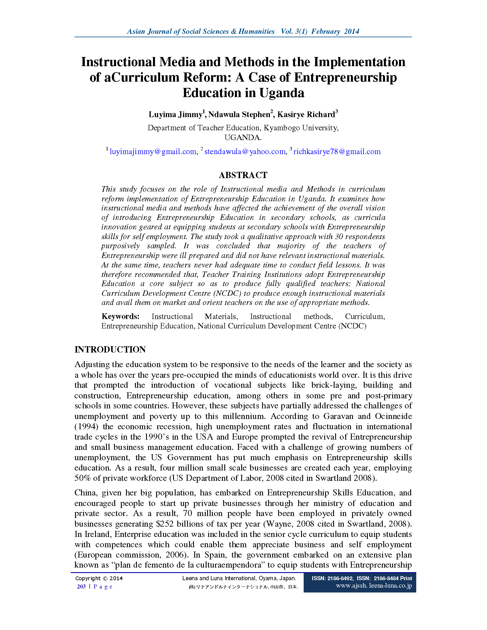 Luyima, J.,Ndawula, S.,Kasirye R. (2014). Instructional Media and methods in the implementation of a curriculum reform : a case of entrepreneurship education in Uganda