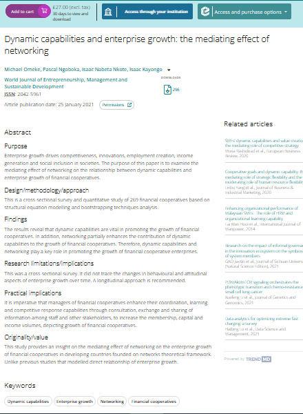 Omeke, M., Ngoboka, P., Nkote, I. N., & Kayongo, I. (2021). Dynamic capabilities and enterprise growth: the mediating effect of networking. World Journal of Entrepreneurship, Management and Sustainable Development, 17(1), 1-15.