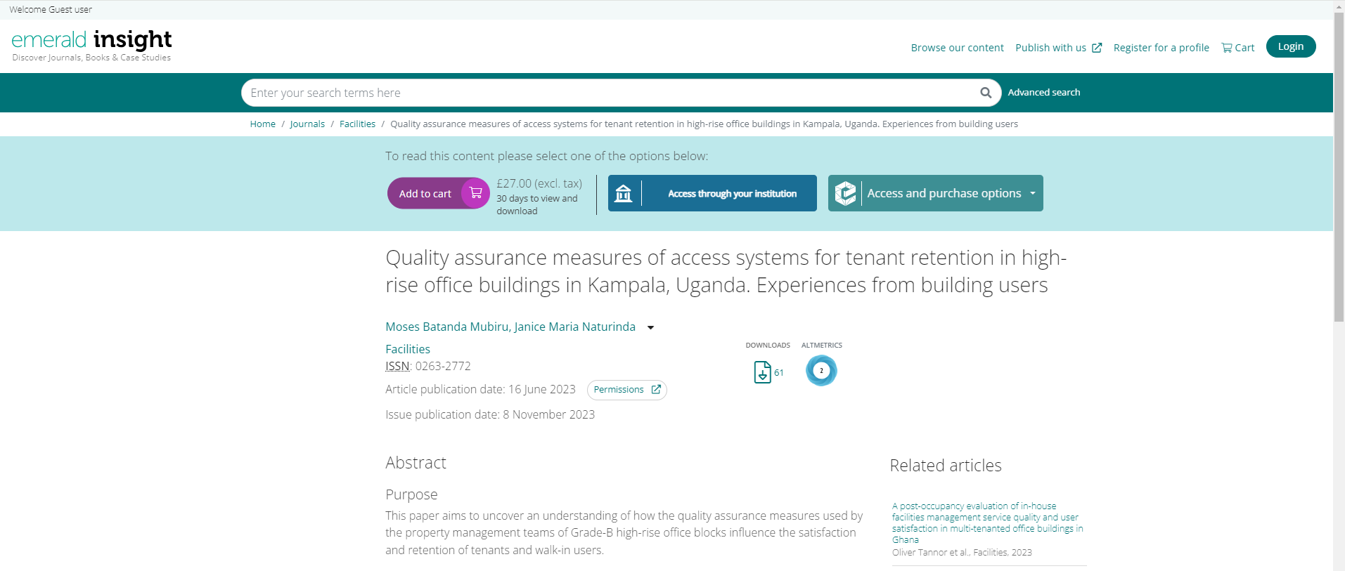 Mubiru, M.B. and Naturinda, J.M. (2023), "Quality assurance measures of access systems for tenant retention in high-rise office buildings in Kampala, Uganda. Experiences from building users", Facilities, Vol. 41 No. 13/14, pp. 839-854. https://doi.org/10.1108/F-08-2022-0106