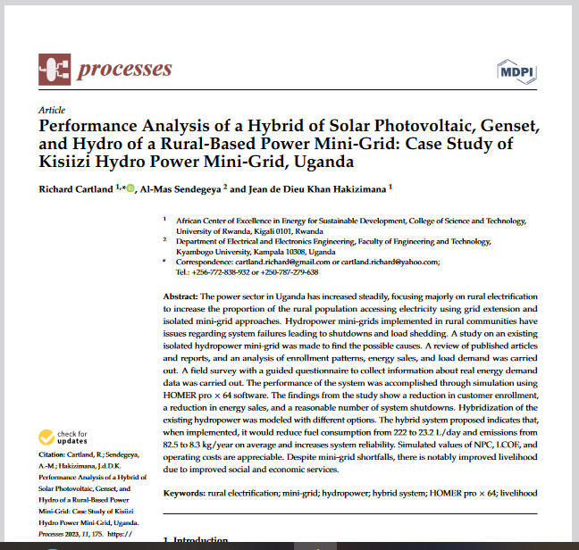 Cartland, R., Sendegeya, A. M., & Hakizimana, J. D. D. K. (2023). Performance Analysis of a Hybrid of Solar Photovoltaic, Genset, and Hydro of a Rural-Based Power Mini-Grid: Case Study of Kisiizi Hydro Power Mini-Grid, Uganda. Processes, 11(1), 175.