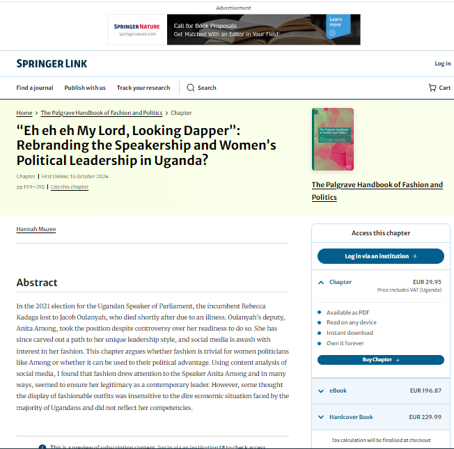 Muzee, H. (2024). “Eh eh eh My Lord, Looking Dapper”: Rebranding the Speakership and Women’s Political Leadership in Uganda?. In The Palgrave Handbook of Fashion and Politics (pp. 199-210). Cham: Springer Nature Switzerland.