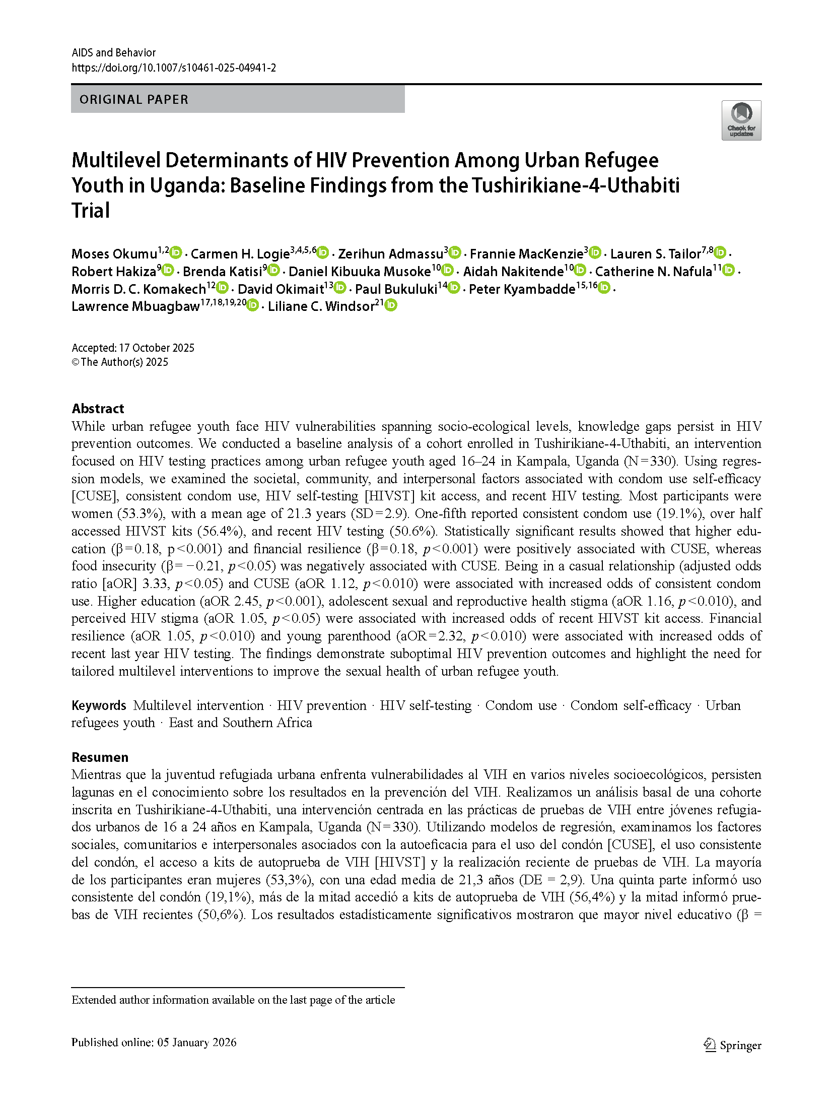 Okumu, M.... et al. (2026). Multilevel Determinants of HIV Prevention Among Urban Refugee Youth in Uganda: Baseline Findings from the Tushirikiane-4-Uthabiti Trial. AIDS and Behavior, 1-15.
