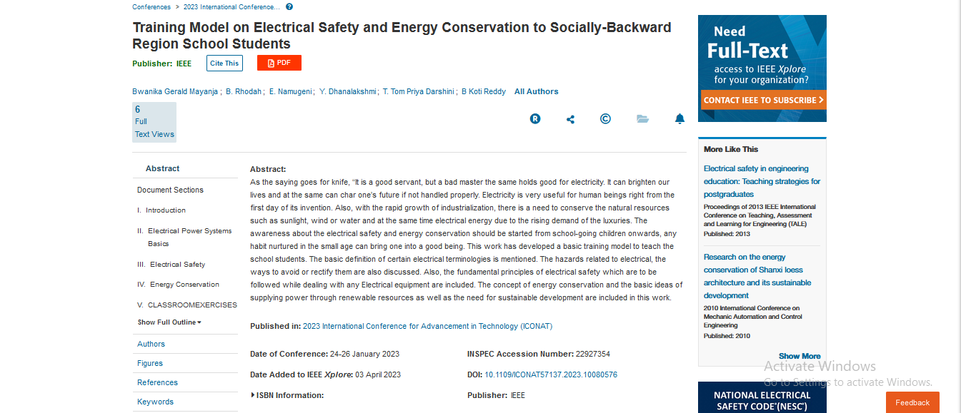 Mayanja, B. G., Rhodah, B., Namugeni, E., Dhanalakshmi, Y., Darshini, T. T. P., & Reddy, B. K. (2023, January). Training Model on Electrical Safety and Energy Conservation to Socially-Backward Region School Students. In 2023 International Conference for Advancement in Technology (ICONAT) (pp. 1-6). IEEE.