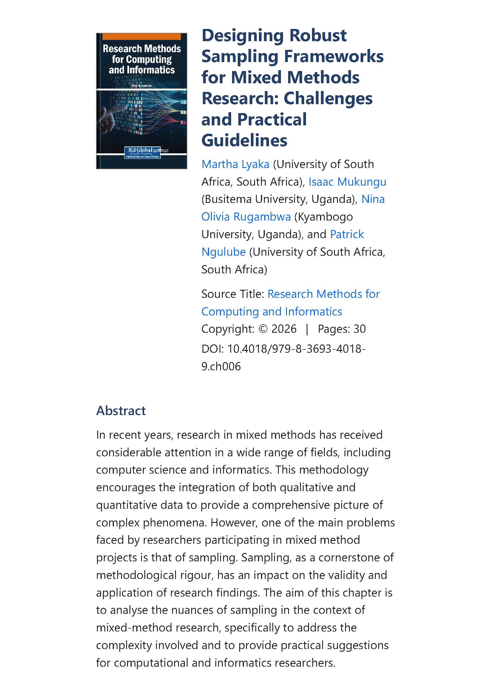 Lyaka, M...et al. (2026). Designing Robust Sampling Frameworks for Mixed Methods Research: challenges and practical guidelines. In Research Methods for Computing and Informatics (pp. 207-236). IGI Global Scientific Publishing.