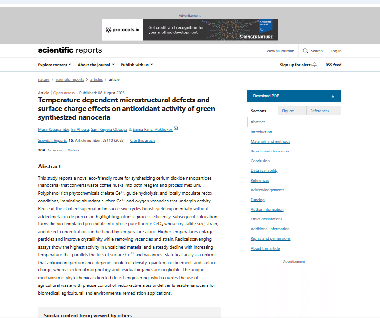 Kabagambe, M., Ahuura, I., Obwoya, S. K., & Mukhokosi, E. P. (2025). Temperature dependent microstructural defects and surface charge effects on antioxidant activity of green synthesized nanoceria. Scientific Reports, 15(1), 1-15.