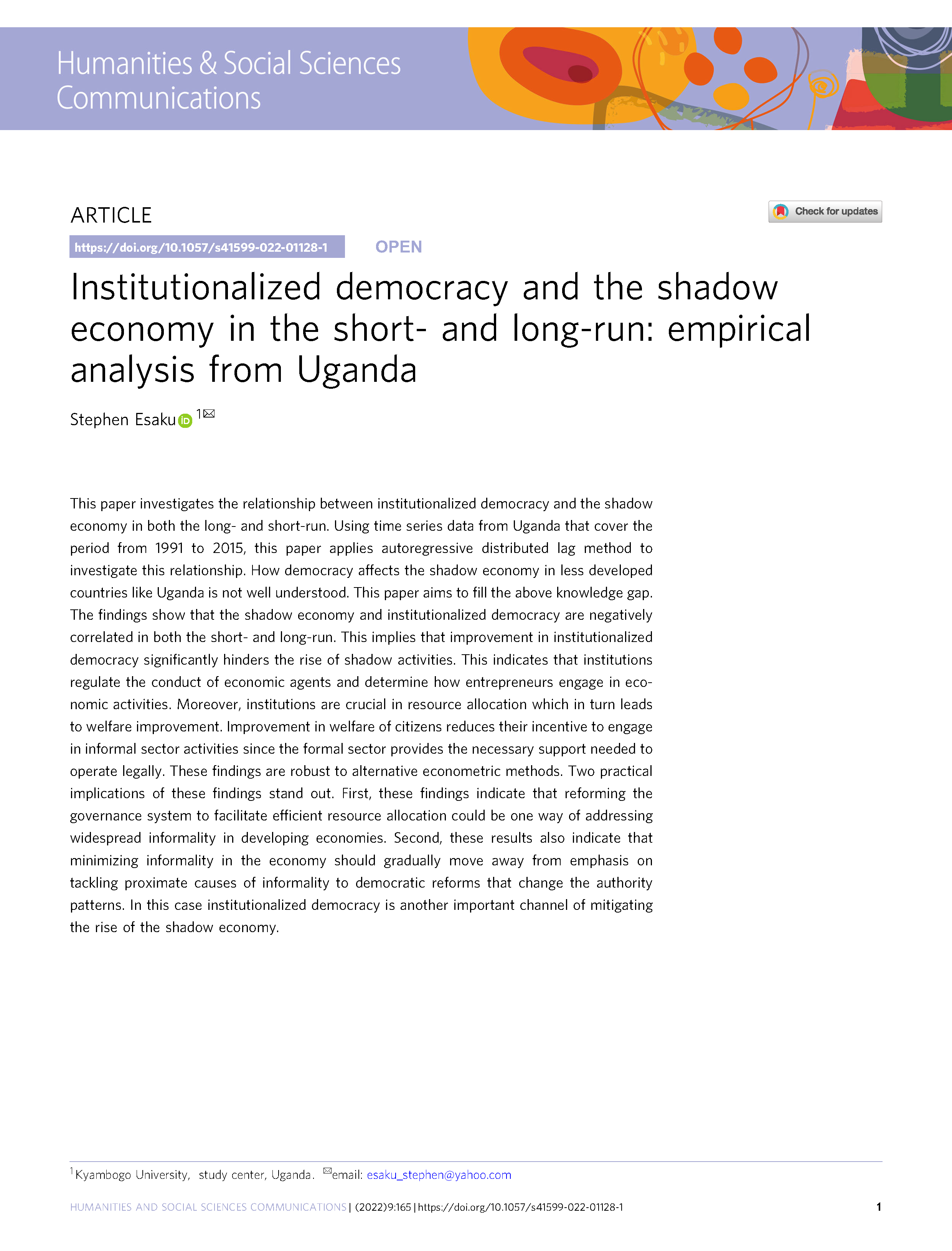 Esaku, S. (2022). Institutionalized democracy and the shadow economy in the short-and long-run: empirical analysis from Uganda. Humanities and Social Sciences Communications, 9(1), 1-12.