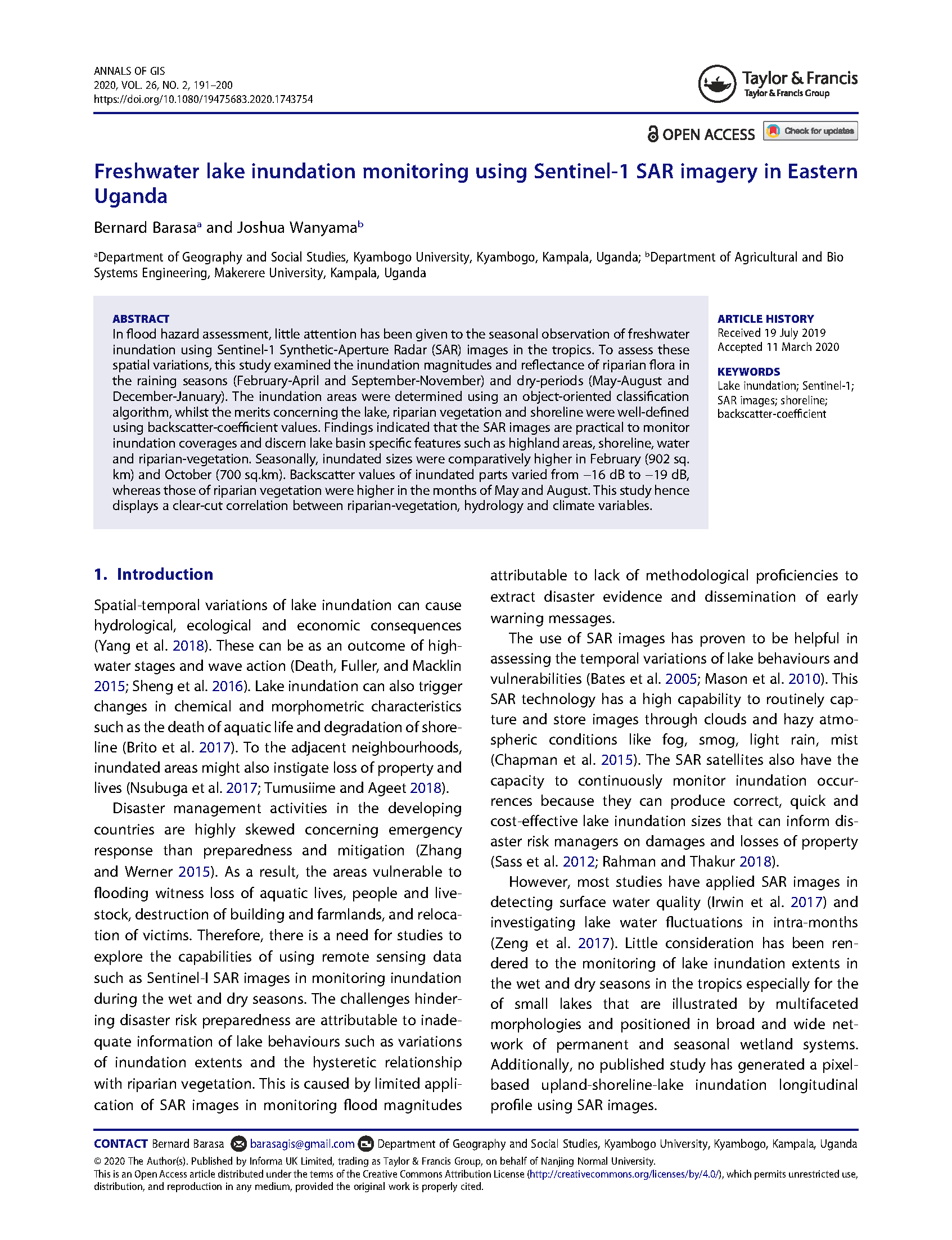 Barasa, B., Wanyama, J. (2020). Freshwater lake inundation monitoring using Sentinel-1 SAR imagery in Eastern Uganda.Taylor&Francis Online: Annals of GIS.https://doi.org/10.1080/19475683.2020.1743754.