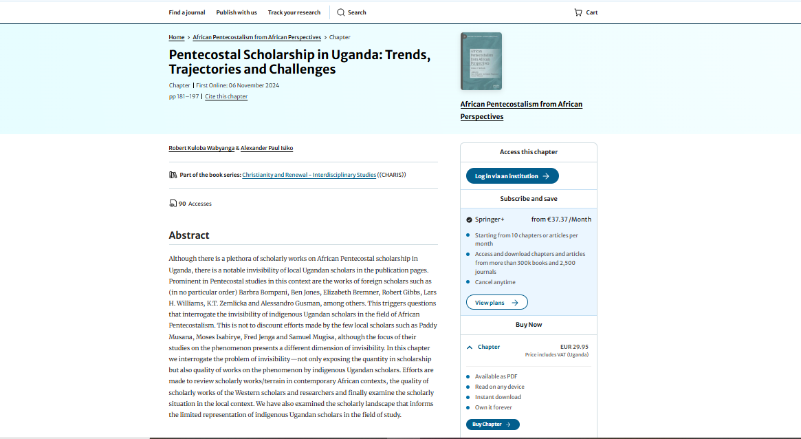 Wabyanga, R. K., & Isiko, A. P. (2024). Pentecostal Scholarship in Uganda: Trends, Trajectories and Challenges. In African Pentecostalism from African Perspectives: Volume 1: Methods (pp. 181-197). Cham: Springer Nature Switzerland.