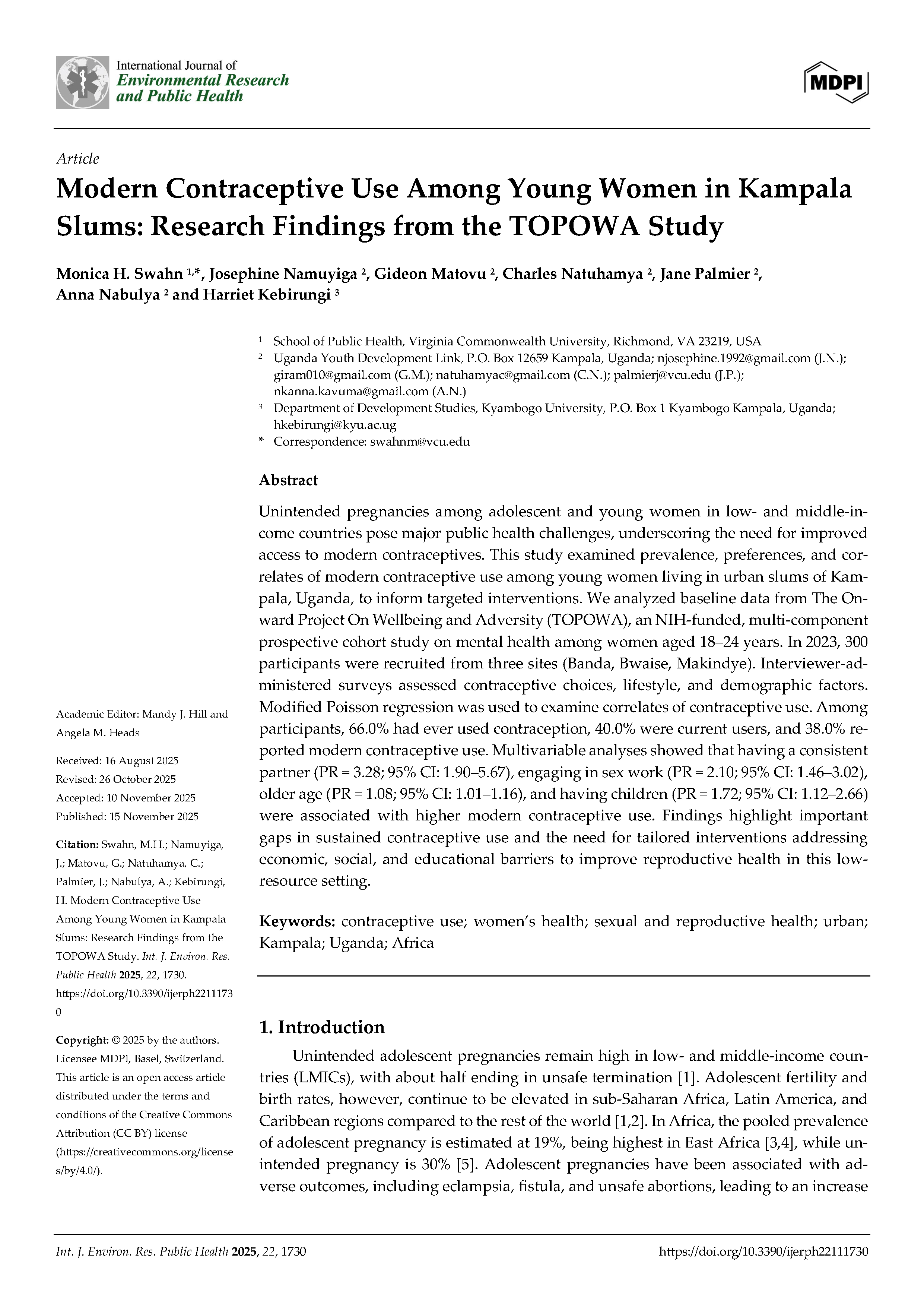Swahn, M.H...et al. (2025). Modern contraceptive use among young women in Kampala slums : research findings from the TOPOWA study. International Journal of Environmental Research and Public Health.