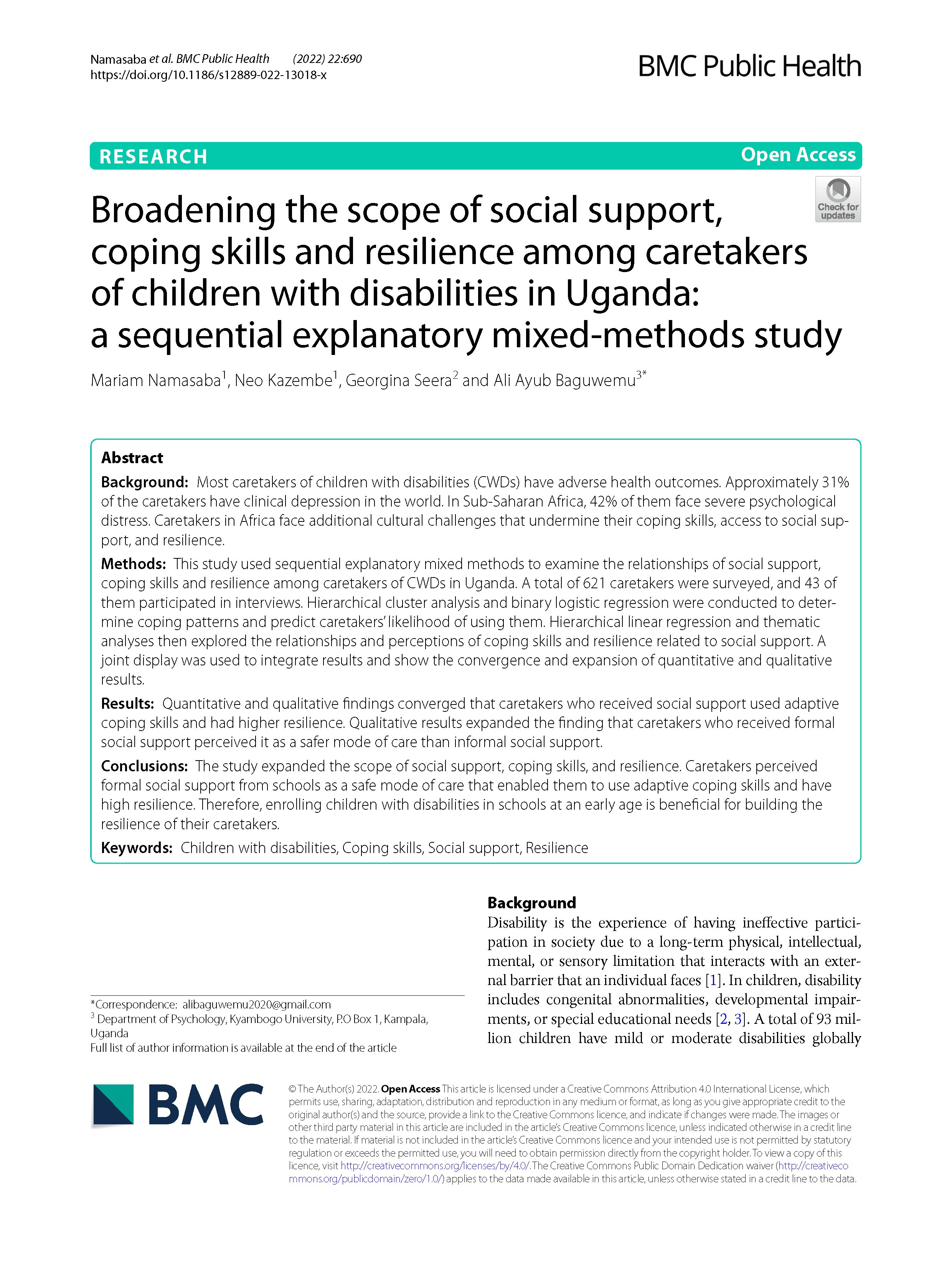 Namasaba, M., Kazembe, N., Seera, G., & Baguwemu, A. A. (2022). Broadening the scope of social support, coping skills and resilience among caretakers of children with disabilities in Uganda: a sequential explanatory mixed-methods study. BMC Public Health, 22(1), 690.