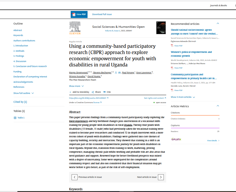 Greenwood, M., Bechange, S., Emong, P., Lawrence, E., Kyosaba, W., Nsajja, D., ... & Baker, E. (2023). Using a community-based participatory research (CBPR) approach to explore economic empowerment for youth with disabilities in rural Uganda. Social Sciences & Humanities Open, 8(1), 100647.