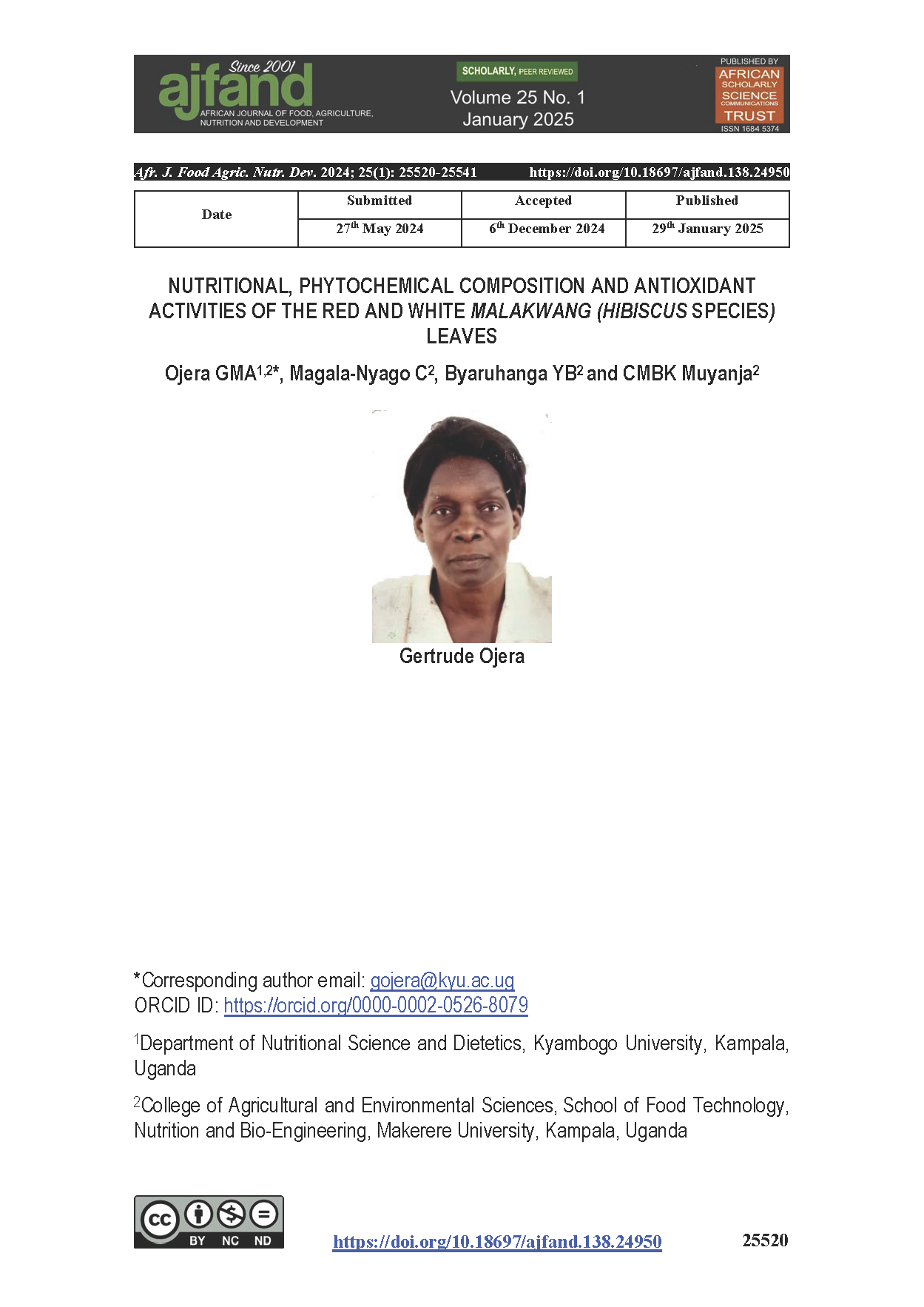 Ojera, GMA (2025) Nutritional, phytochemical composition and antioxidant activities of the red and white malakwang (hibiscus species) leaves. African scholarly science communications trust