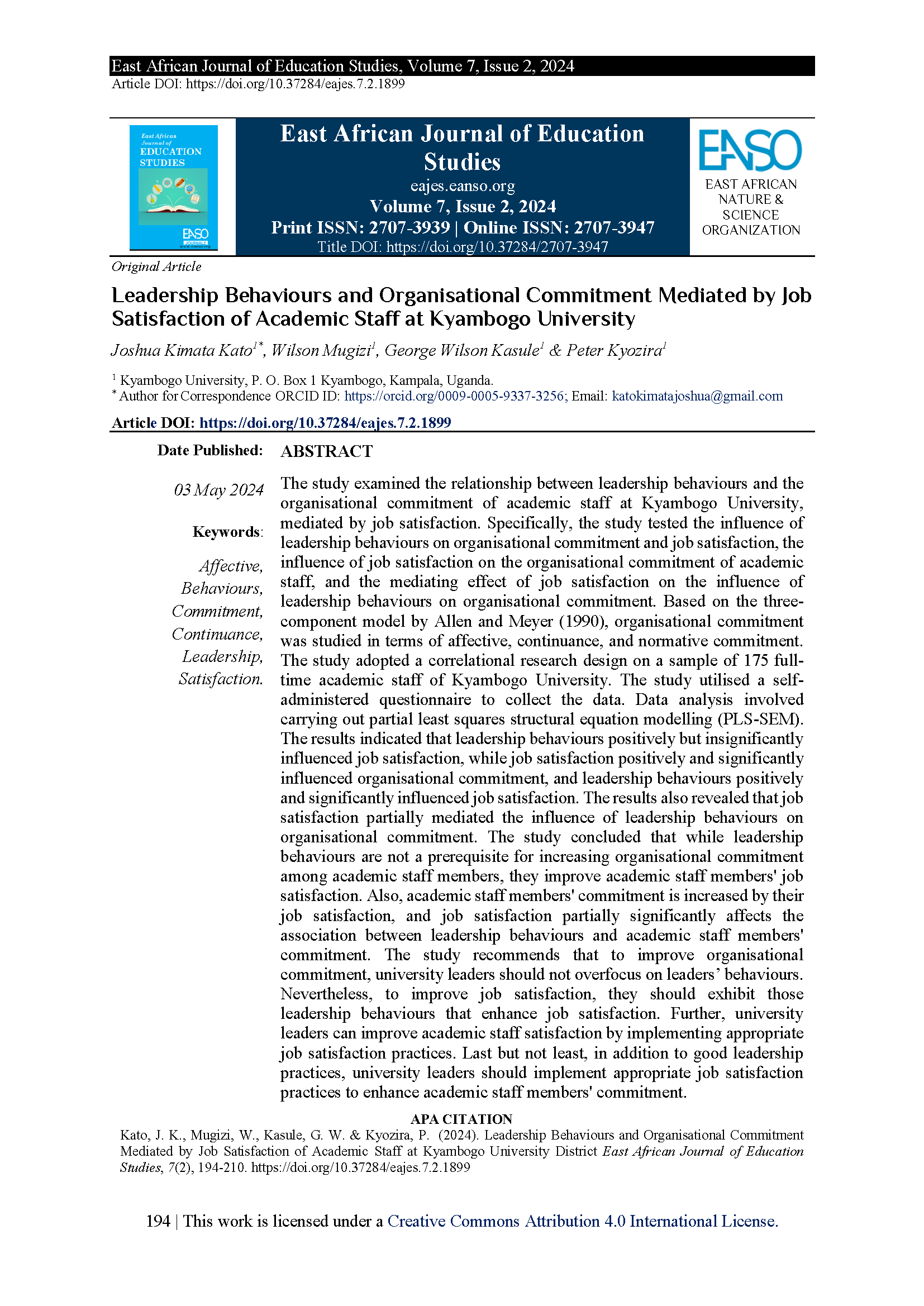 Kato, J. K., Mugizi, W., Kasule, G. W., & Kyozira, P. (2024). Leadership Behaviours and Organisational Commitment Mediated by Job Satisfaction of Academic Staff at Kyambogo University. East African Journal of Education Studies, 7(2), 194-210.