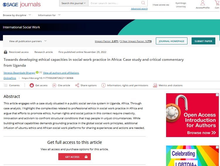 Bwambale Bhangyi, V. (2022). Towards developing ethical capacities in social work practice in Africa: Case study and critical commentary from Uganda. International Social Work, 0(0). https://doi.org/10.1177/00208728221136968