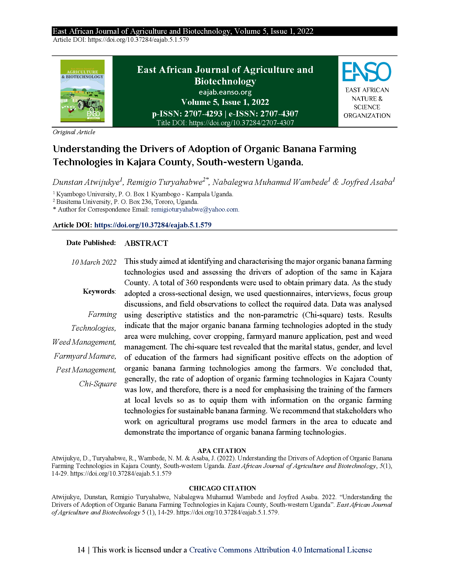 Understanding the drivers of adoption of organic banana farming technologies in Kajara County, South-western Uganda