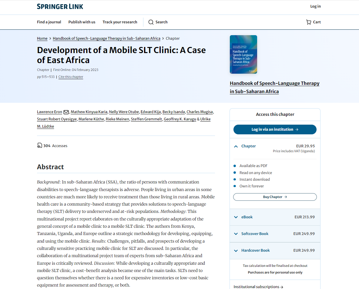 Eron, L. et al. (2023). Development of a Mobile SLT Clinic: A Case of East Africa. In: Lüdtke, U.M., Kija, E., Karia, M.K. (eds) Handbook of Speech-Language Therapy in Sub-Saharan Africa. Springer, Cham. https://doi.org/10.1007/978-3-031-04504-2_25