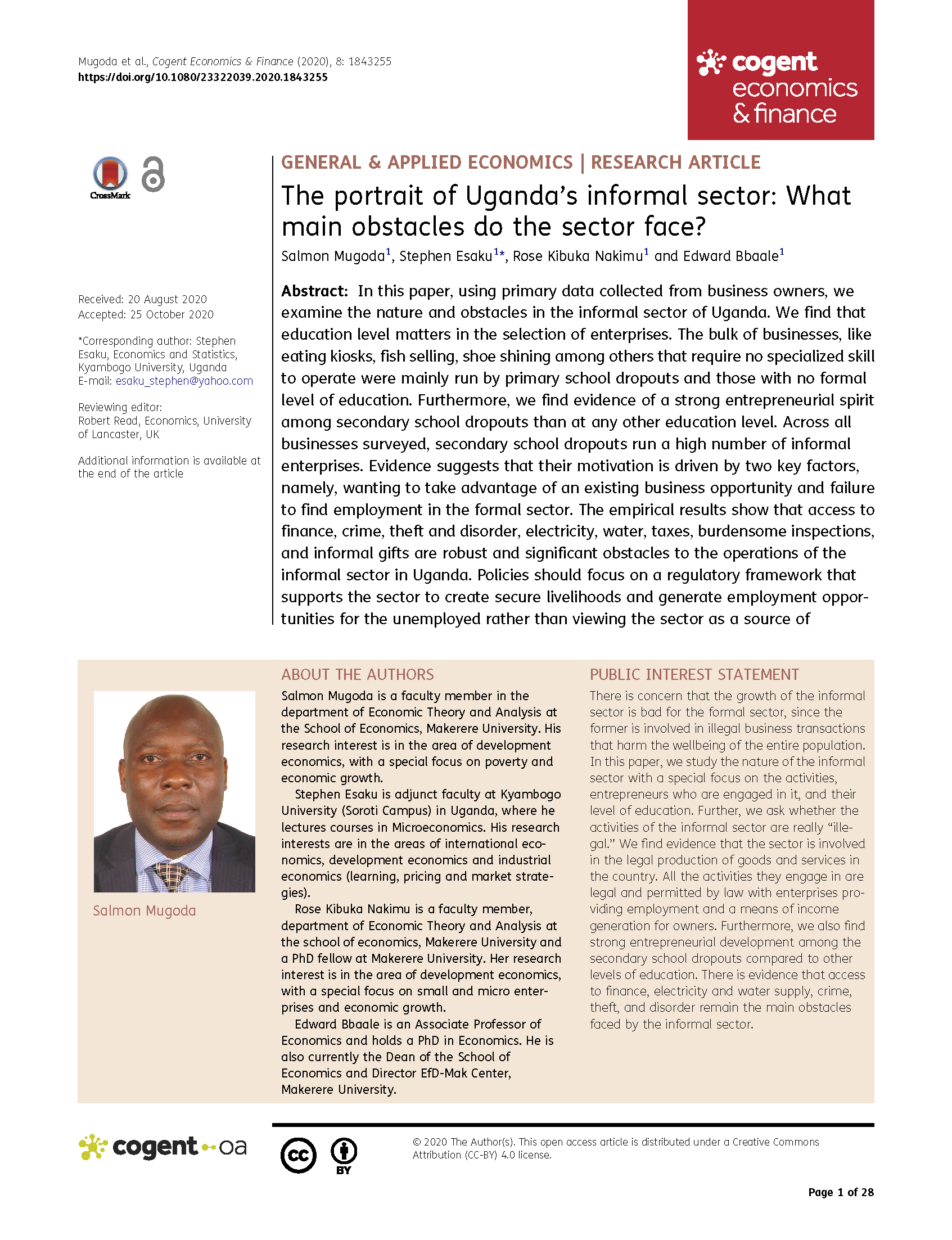 | dc.identifier.citation | Mugoda, S., Esaku, S., Nakimu, R. K., & Bbaale, E. (2020). The portrait of Uganda’s informal sector: What main obstacles do the sector face?. Cogent Economics & Finance, 8(1), 1843255. | en_US |
