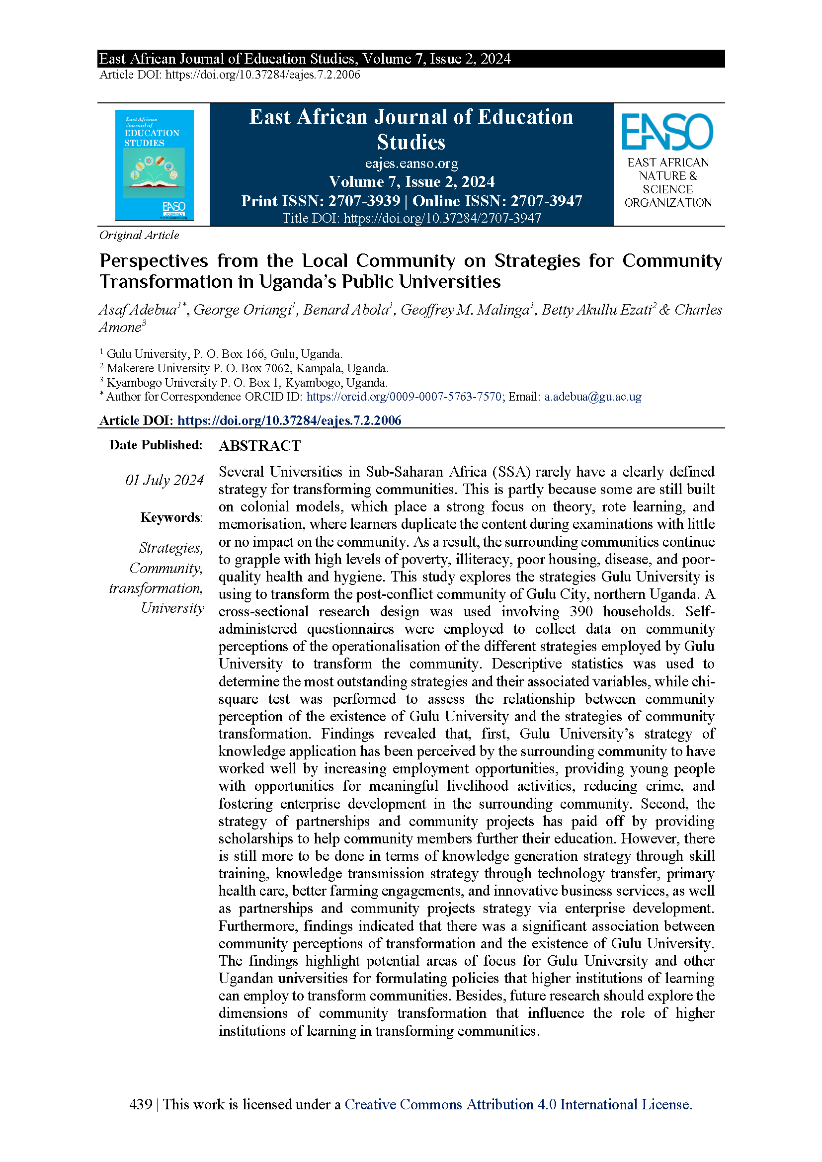 Adebua, A., Oriangi, G., Abola, B., Malinga, G. M., Ezati, B., & Amone, C. (2024). Perspectives from the Local Community on Strategies for Community Transformation in Uganda’s Public Universities. East African Journal of Education Studies, 7(2), 439-452.