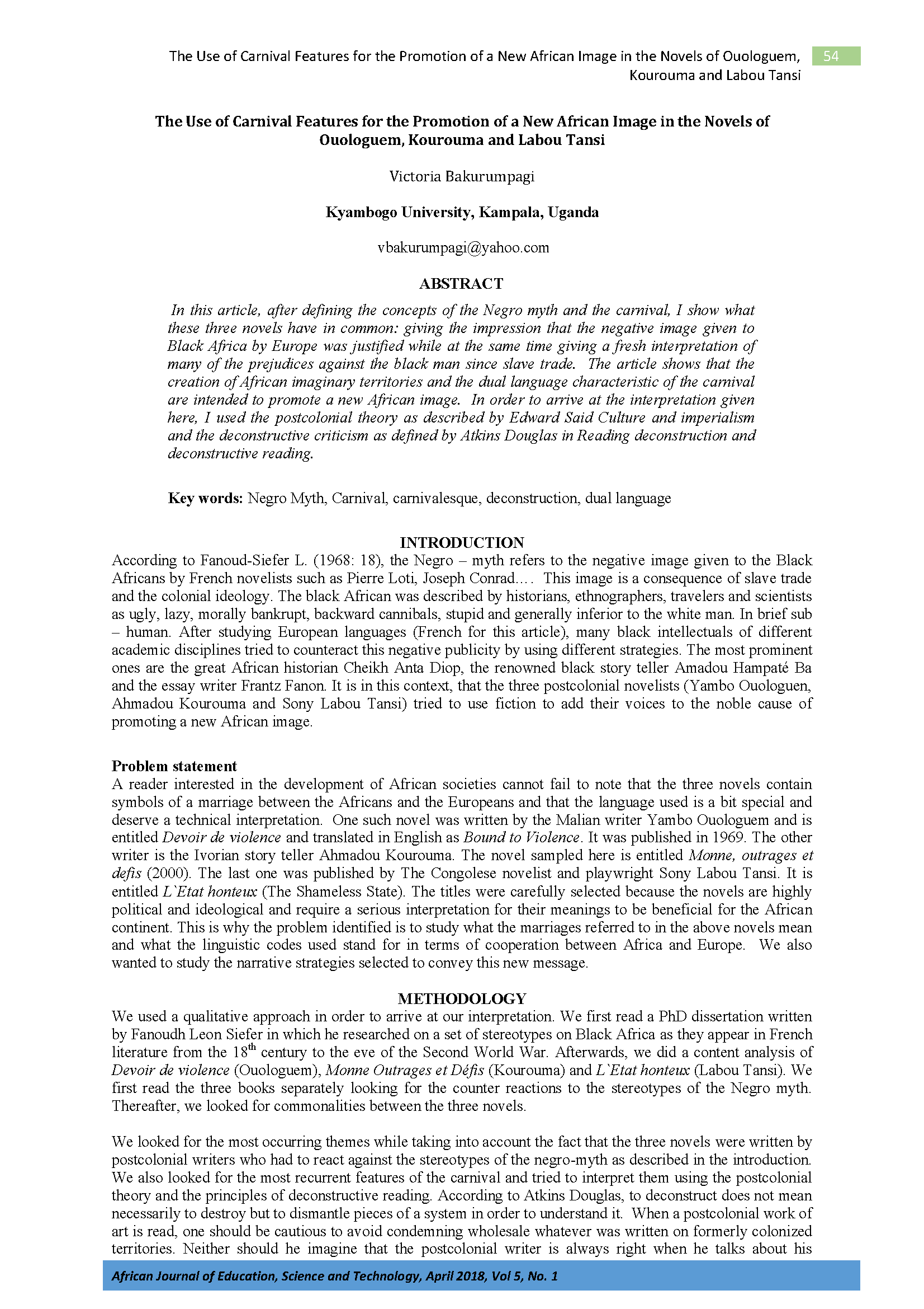 Bakurumpagi, V. (2018). The Use of Carnival Features for the Promotion of a New African Image in the Novels of Ouologuem, Kourouma and Labou Tansi. African Journal of Education, Science and Technology, 5(1), 54-58.