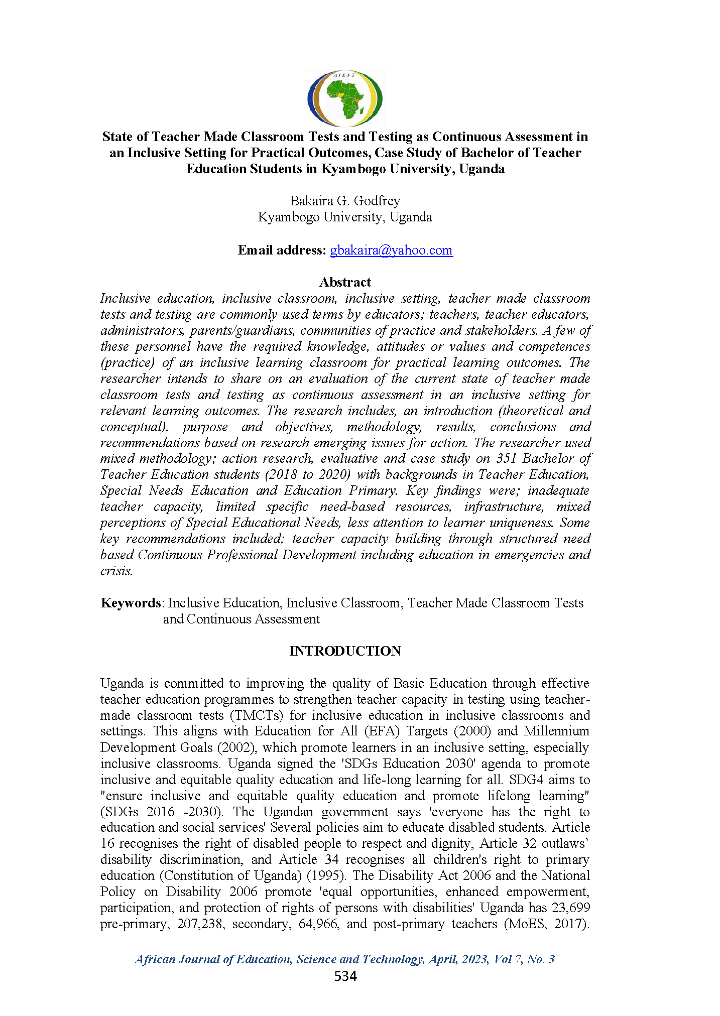 Bakaira, G. G. (2023). State of Teacher Made Classroom Tests and Testing as Continuous Assessment in an Inclusive Setting for Practical Outcomes, Case Study of Bachelor of Teacher Education Students in Kyambogo University, Uganda. African Journal of Education, Science and Technology, 7(3).