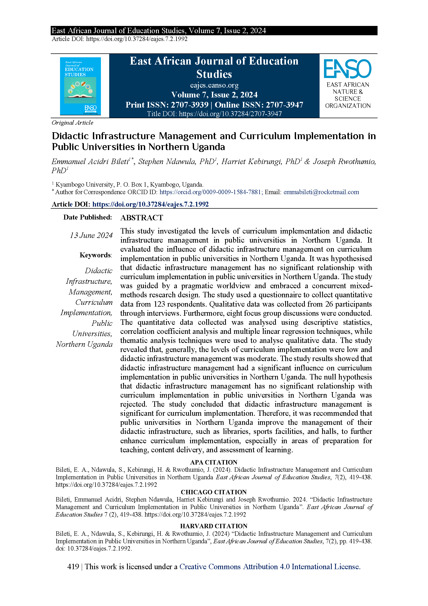 Bileti, E. A., Ndawula, S., Kebirungi, H., & Rwothumio, J. (2024). Didactic Infrastructure Management and Curriculum Implementation in Public Universities in Northern Uganda. East African Journal of Education Studies, 7(2), 419-438.