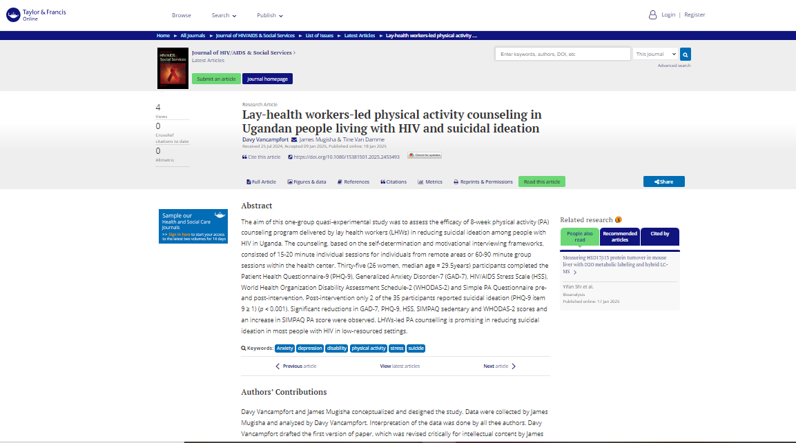| dc.identifier.citation | Vancampfort, D., Mugisha, J., & Van Damme, T. (2025). Lay-health workers-led physical activity counseling in Ugandan people living with HIV and suicidal ideation. Journal of HIV/AIDS & Social Services, 1-16. | |