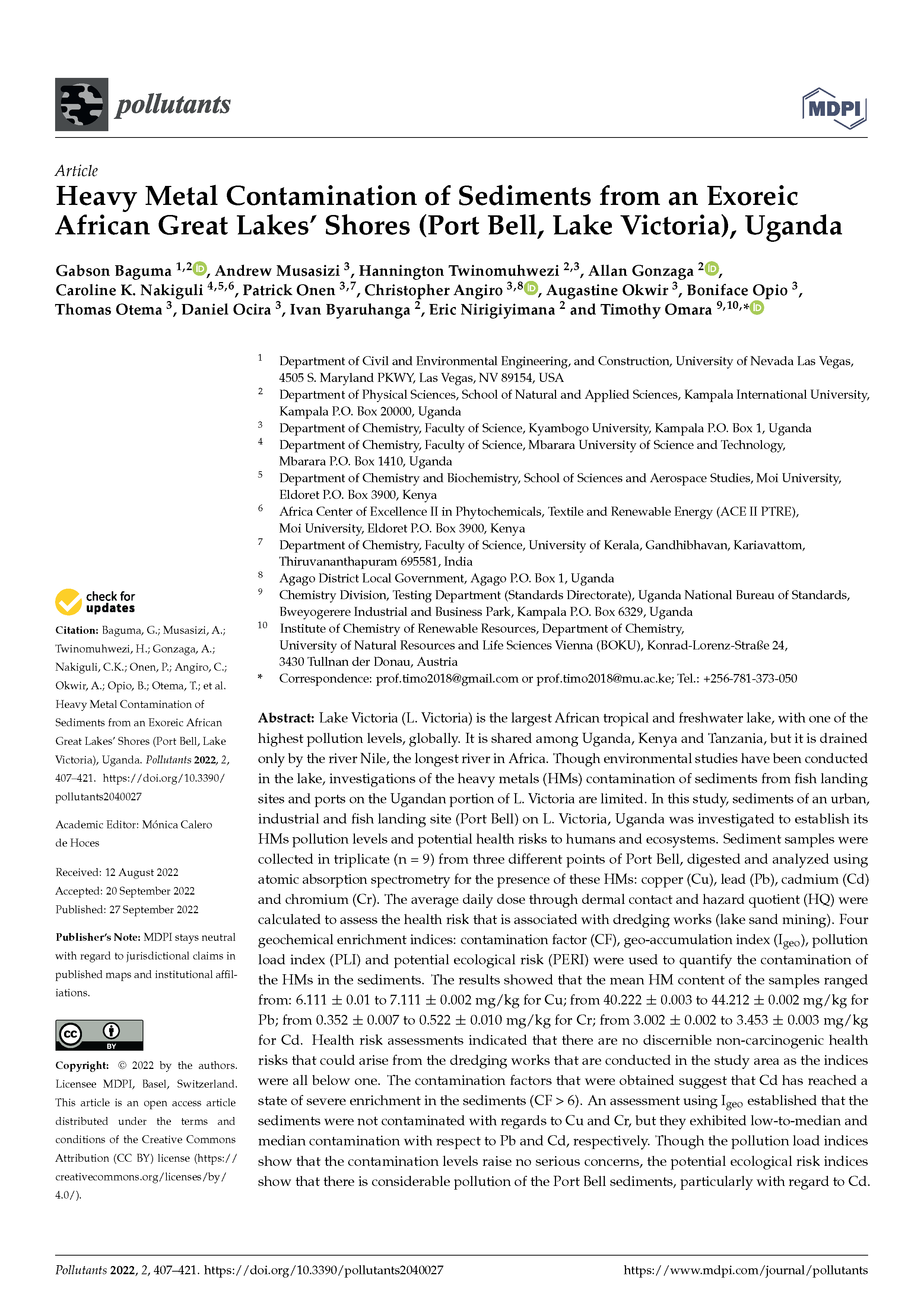 Baguma, G., Musasizi, A., Twinomuhwezi, H., Gonzaga, A., Nakiguli, C. K., Onen, P., ... & Omara, T. (2022). Heavy metal contamination of sediments from an exoreic african great lakes’ shores (Port Bell, Lake Victoria), Uganda. Pollutants, 2(4), 407-421.