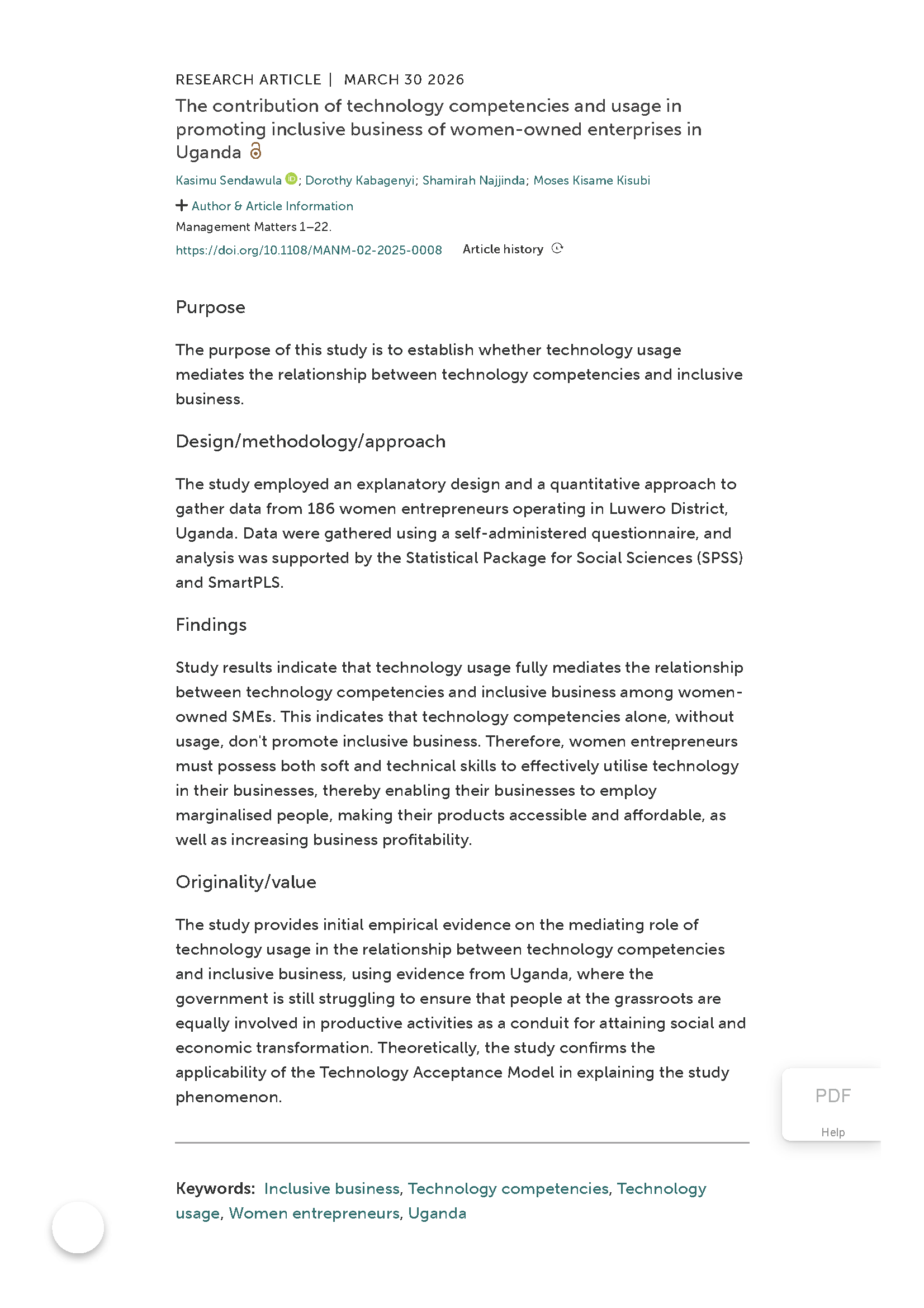 Sendawula K, Kabagenyi D, Najjinda S, Kisubi MK (2026;), "The contribution of technology competencies and usage in promoting inclusive business of women-owned enterprises in Uganda". Management Matters, Vol. ahead-of-print No. ahead-of-print. https://doi.org/10.1108/MANM-02-2025-0008