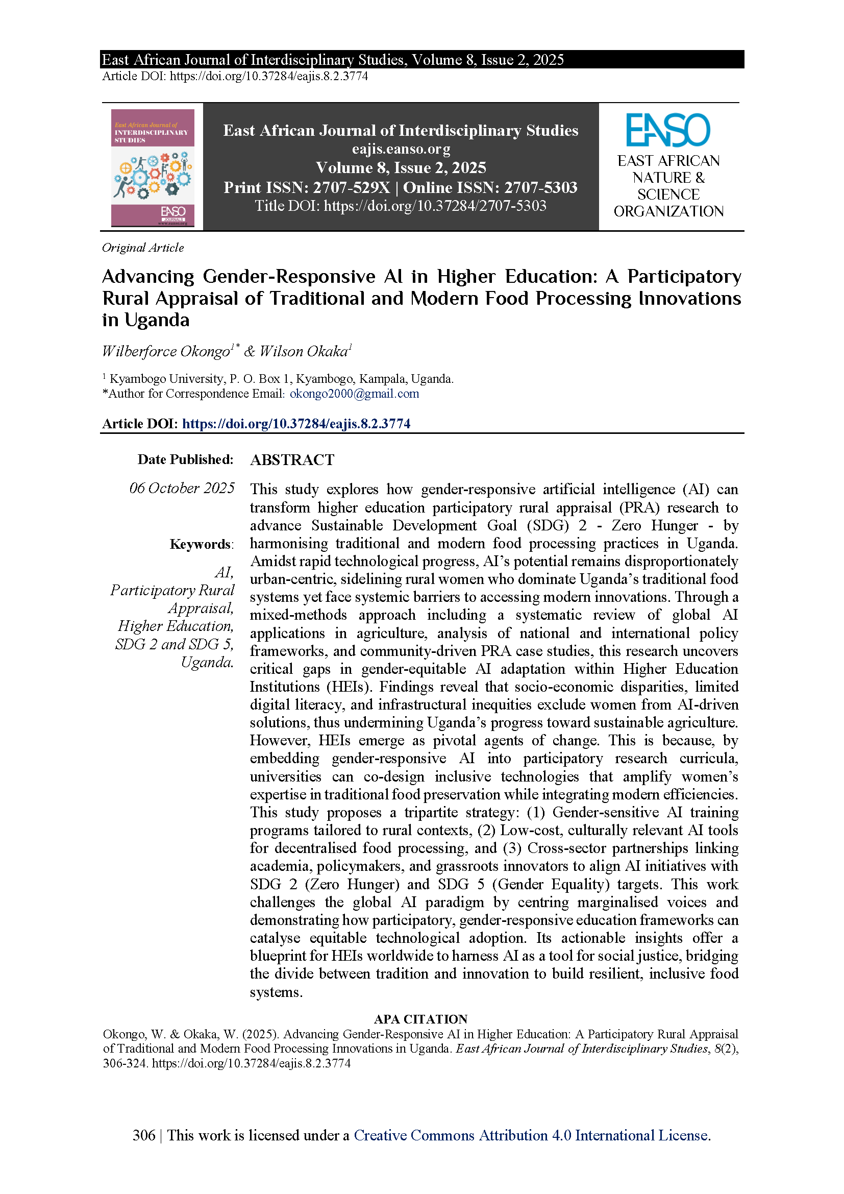 Okongo, W. & Okaka, W. (2025). Advancing Gender-Responsive AI in Higher Education: A Participatory Rural Appraisal of Traditional and Modern Food Processing Innovations in Uganda. East African Journal of Interdisciplinary Studies, 8(2), 306-324. https://doi.org/10.37284/eajis.8.2.3774