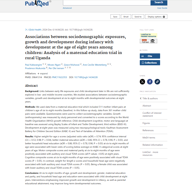 Kakwangire, P., Ngari, M., Muhoozi, G., Westerberg, A. C., Atukunda, P., & Iversen, P. O. (2024). Associations between sociodemographic exposures, growth and development during infancy with development at the age of eight years among children: Analysis of a maternal education trial in rural Uganda. Journal of Global Health, 14, 04228.