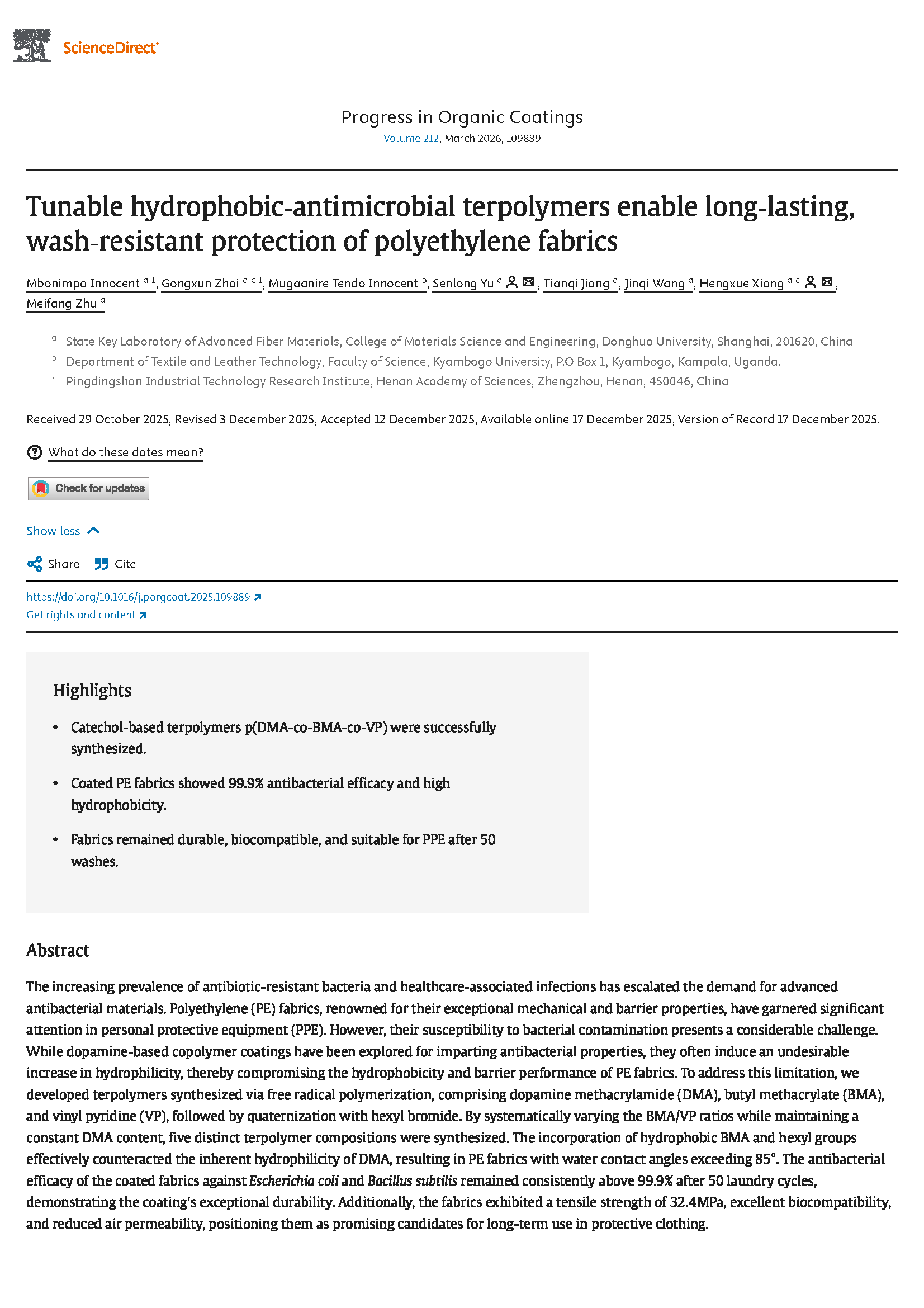 Innocent, M., Zhai, G., Innocent, M. T., Yu, S., Jiang, T., Wang, J., ... & Zhu, M. (2026). Tunable hydrophobic‑antimicrobial terpolymers enable long‑lasting, wash‑resistant protection of polyethylene fabrics. Progress in Organic Coatings, 212, 109889.