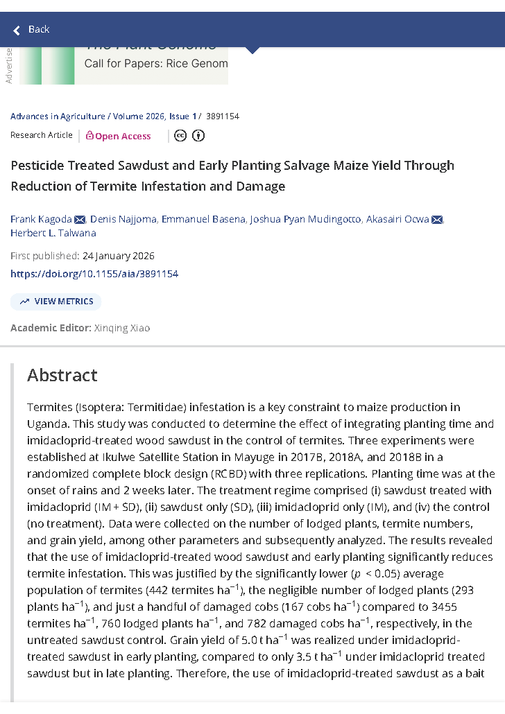 Kagoda, F., Najjoma, D., Basena, E., Mudingotto, J. P., Ocwa, A., & Talwana, H. L. (2026). Pesticide Treated Sawdust and Early Planting Salvage Maize Yield Through Reduction of Termite Infestation and Damage. Advances in Agriculture, 2026(1), 3891154.