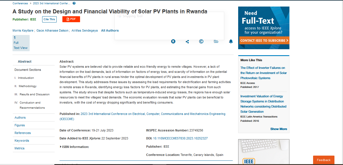 | dc.identifier.citation | Kayitare, M., Dalson, G. A., & Sendegeya, A. M. (2023, July). A Study on the Design and Financial Viability of Solar PV Plants in Rwanda. In 2023 3rd International Conference on Electrical, Computer, Communications and Mechatronics Engineering (ICECCME) (pp. 1-6). IEEE. | en_US |