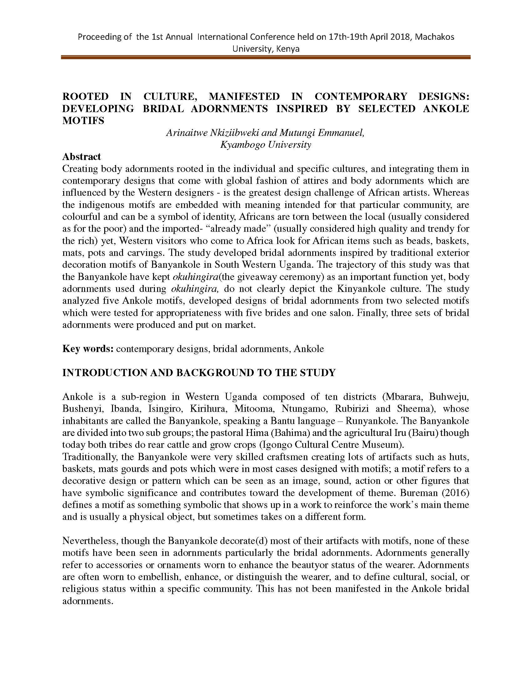 Nkiziibweki, A., & Mutungi, E. (2018). Rooted in culture, manifested in contemporary designs: developing bridal adornments inspired by selected Ankole motifs.