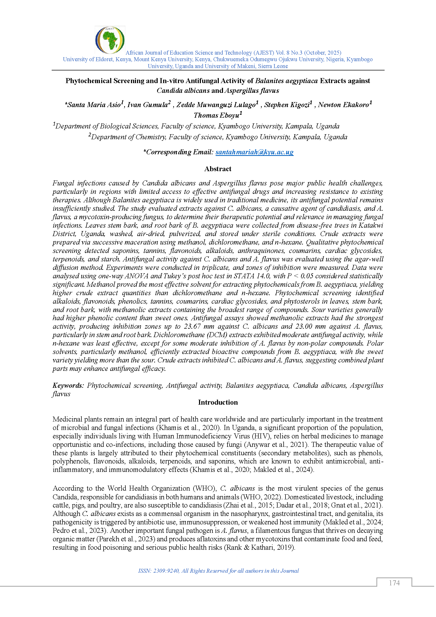 Asio, S. M... et al. (2025). Phytochemical Screening and In-vitro Antifungal Activity of Balanites aegyptiaca Extracts against Candida albicans and Aspergillus flavus. African Journal of Education, Science and Technology (AJEST), 8(3), 169-181.