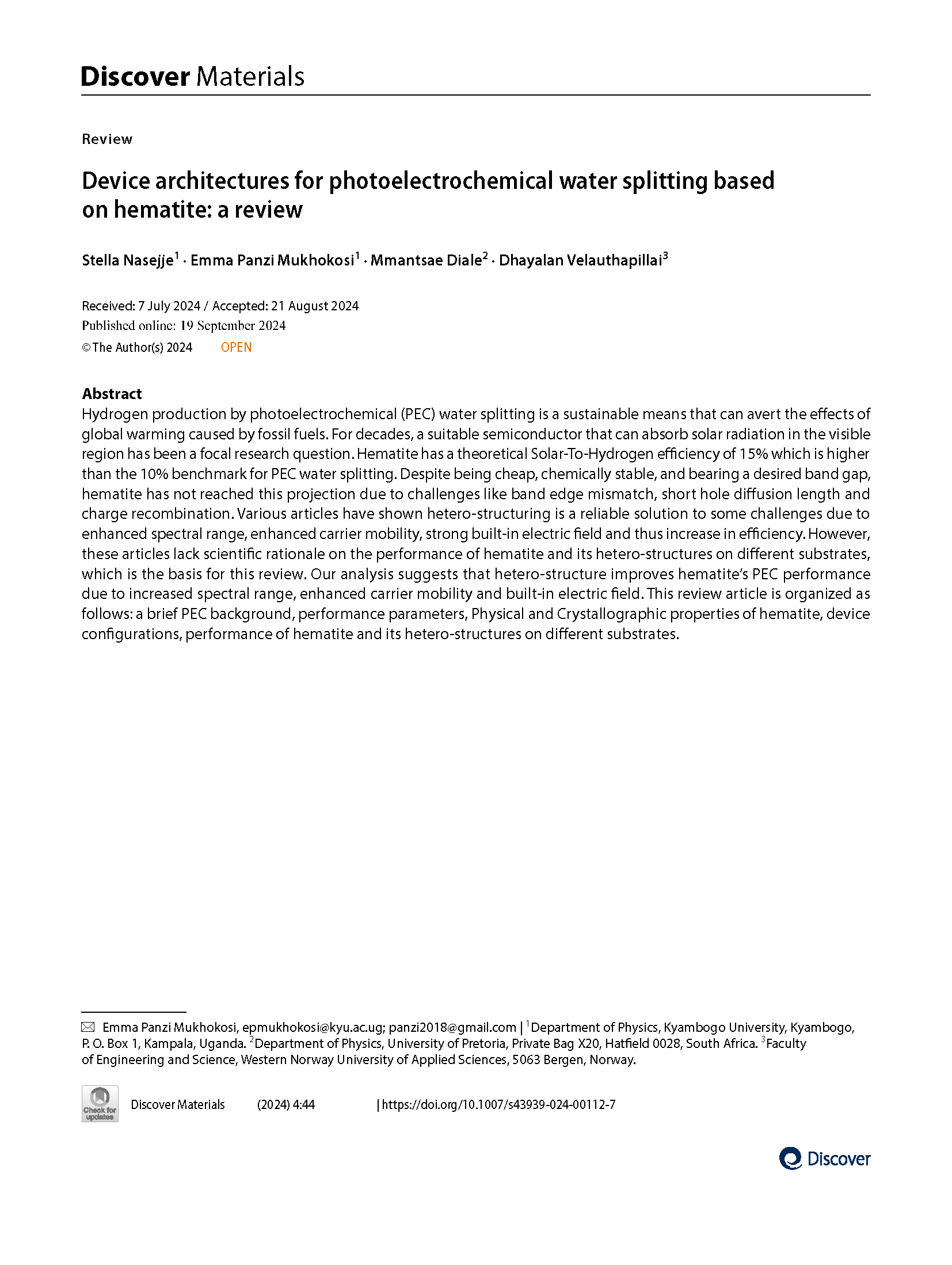 | dc.identifier.citation | Nasejje, S., Mukhokosi, E. P., Diale, M., & Velauthapillai, D. (2024). Device architectures for photoelectrochemical water splitting based on hematite: a review. Discover Materials, 4(1), 44. | |