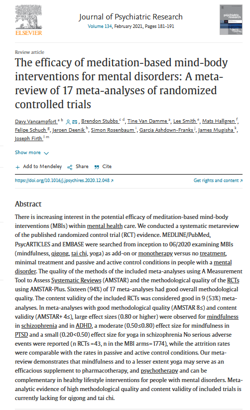 Vancampfort, D...et al (2021). The efficacy of meditation-based mind-body interventions for mental disorders: a meta-review of 17 meta-analyses of randomized controlled trials. Elsevier: Journal of Psychiatric Research. https://doi.org/10.1016/j.jpsychires.2020.12.048.
